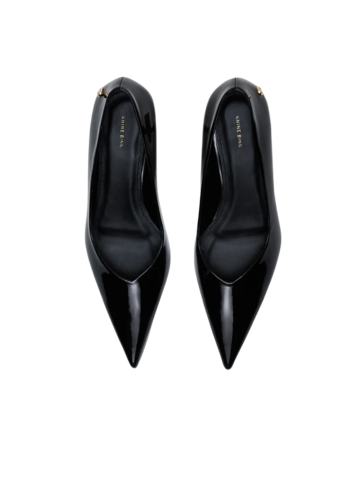 An elegant dress pump made from black patent leather with a high-shine finish. The Hilda Pumps' sleek construction features a sharp pointed toe, angular kitten heel, high-shine outsole, and cushioned insole. Accented with gold-tone ANINE BING hardware at each heel.