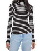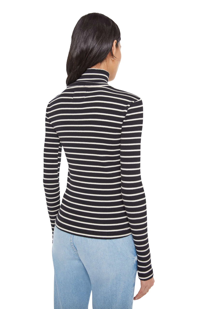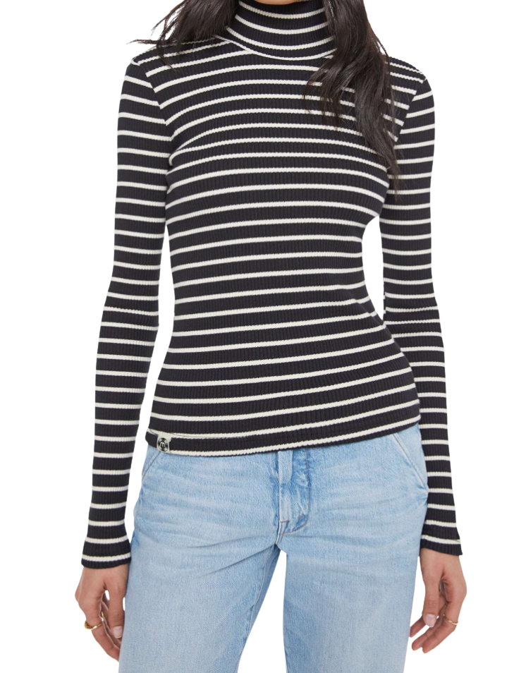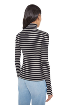 A long sleeve top with a folded turtleneck and a narrow fit. Made from 100% cotton, the top is designed in black with thin white stripes.