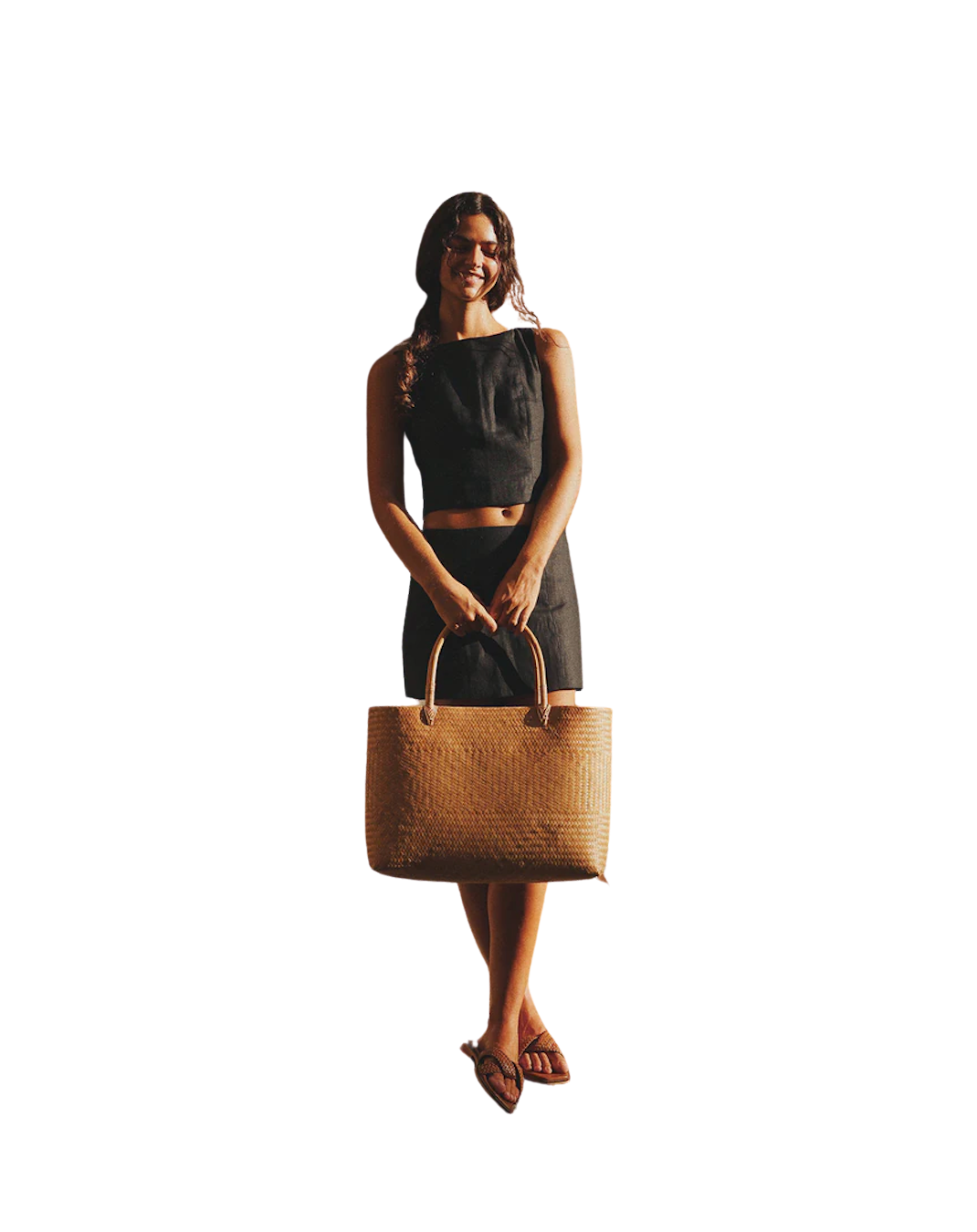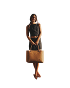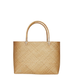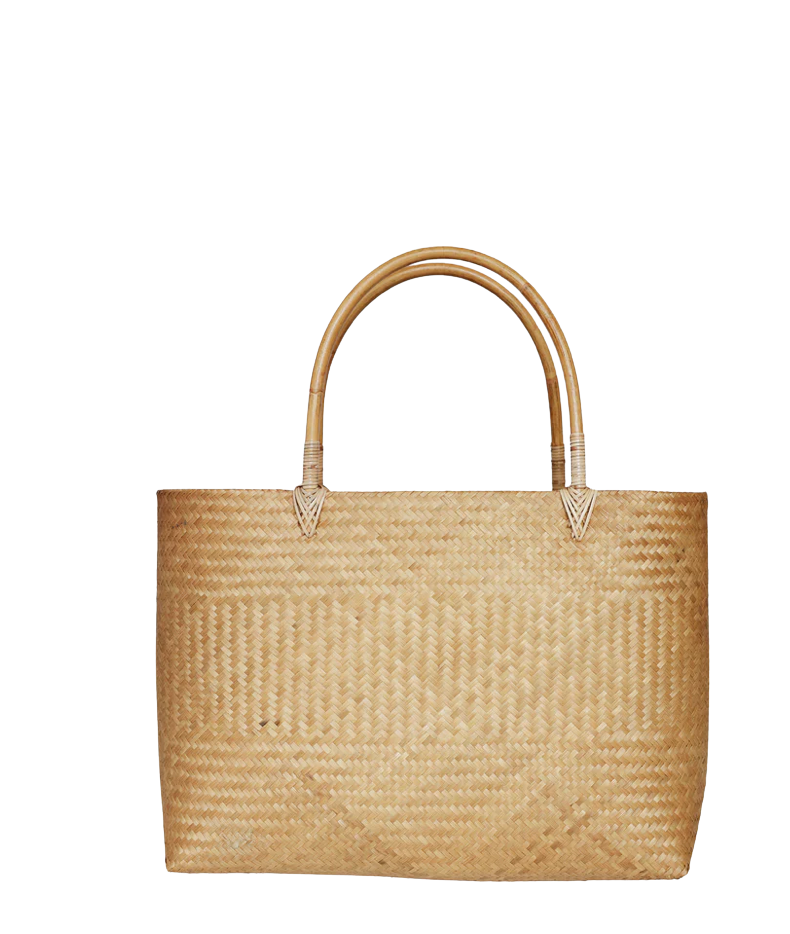 A 100% bamboo tote made of all natural materials. Structured body with two stiff top handles and intricate woven design. A statement piece to wear on vacation and all summer long.
