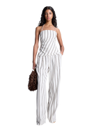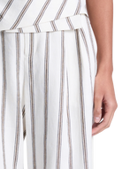 The Charles Pant is crafted in a cream-hued striped linen blend—woven in Portugal from breathable linen, softly draping viscose, and a touch of stretch—finished with fine vertical stripes in black, navy, and tan. This floor-length silhouette features a high-rise waist designed to sit just below the navel, with refined front pleats and relaxed, wide legs.