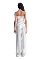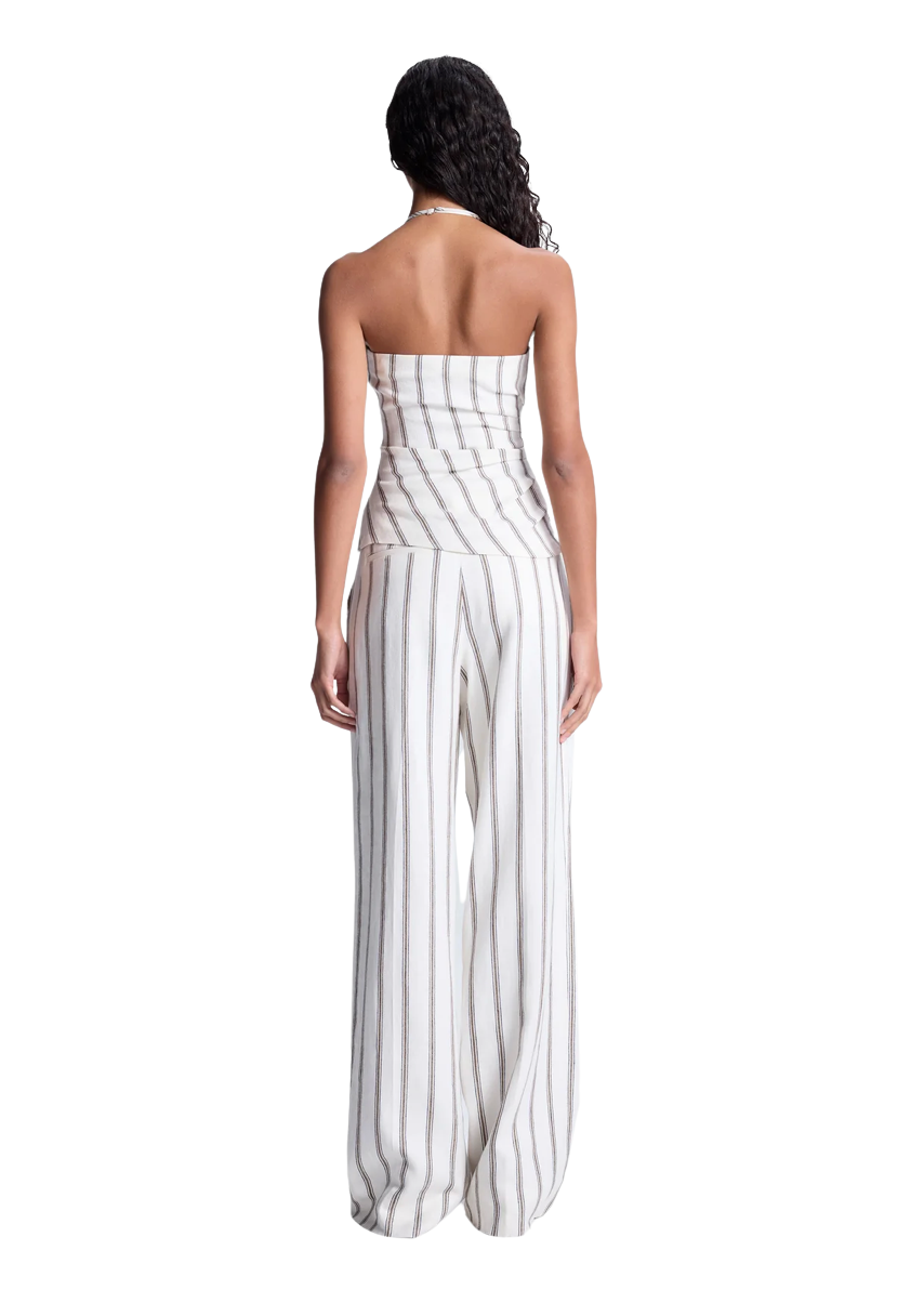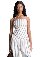 The Charlotte Top is crafted in a cream-hued striped linen blend—woven in Portugal from breathable linen, softly draping viscose, and a touch of stretch—finished with fine vertical stripes in black, navy, and tan. This adjustable halter-style silhouette features a straight neckline and angled pleating through the waist for subtle structure and dimension.