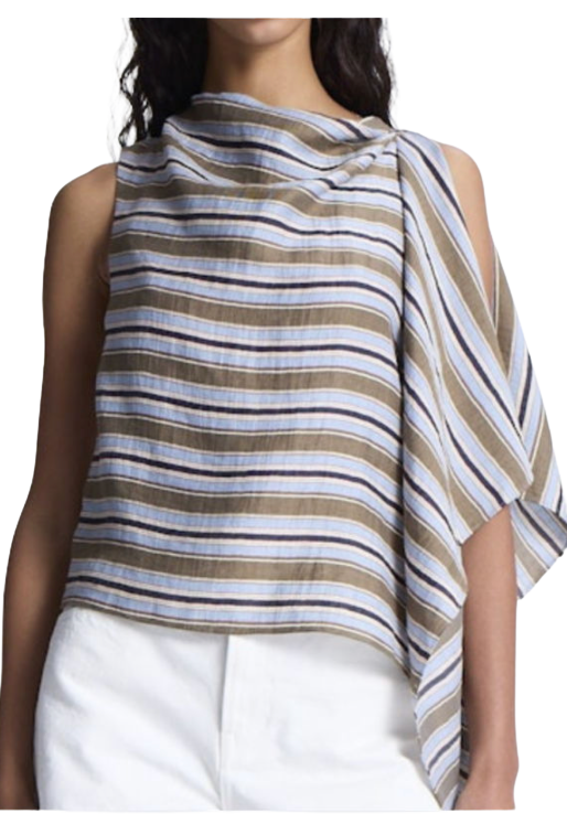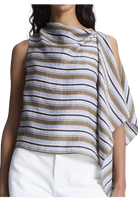 A modern twist on classic stripes. This asymmetrical top features a striking one-shoulder silhouette and bold stripe pattern for a fresh, contemporary look. Perfect for day-to-night styling, it pairs effortlessly with everything from tailored trousers to relaxed denim. Fabric: 88% Linen, 12% Nylon.