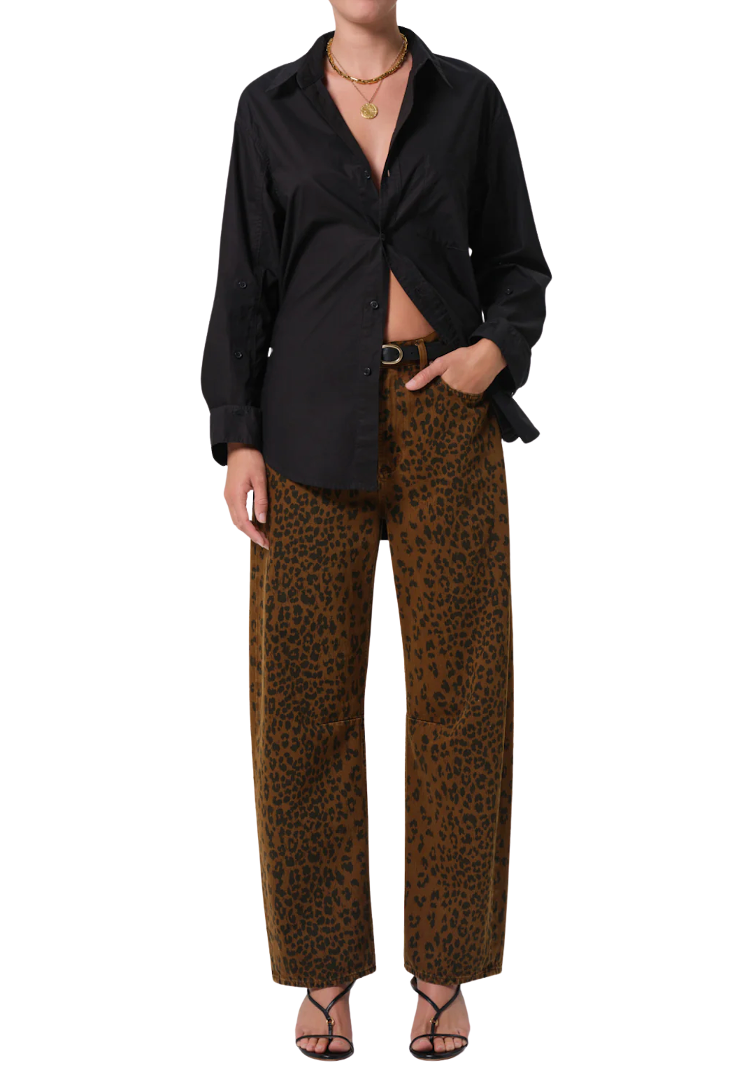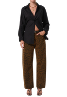 A low-slung relaxed jean crafted from rigid, non-stretch denim for a structured yet effortless feel. The silhouette tapers to the ankle, creating a clean, contemporary line. Dark brown denim with subtle black cheetah print detailing brings a refined, unexpected touch—perfect styled with minimal layers and sleek footwear for a polished, modern look.