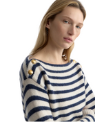 Long sleeve boatneck sweater from Nili Lotan. Chunky weight jersey with stripe. Relaxed fit, short body length. Regular sleeve length. 1x1 rib at hem and sleeve. Fashioning at sleeve. Gold crest buttons at shoulders. Signature center back cable detail.