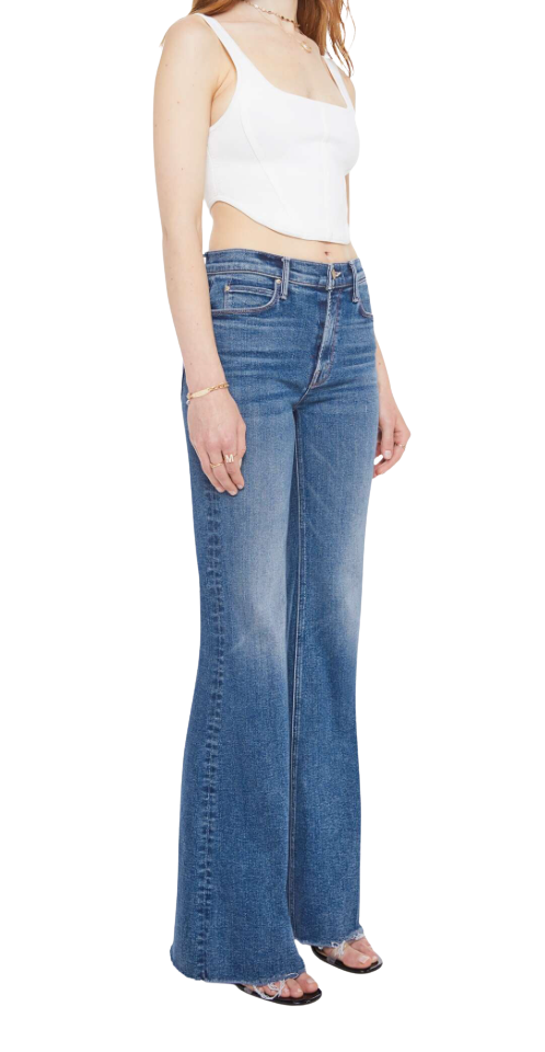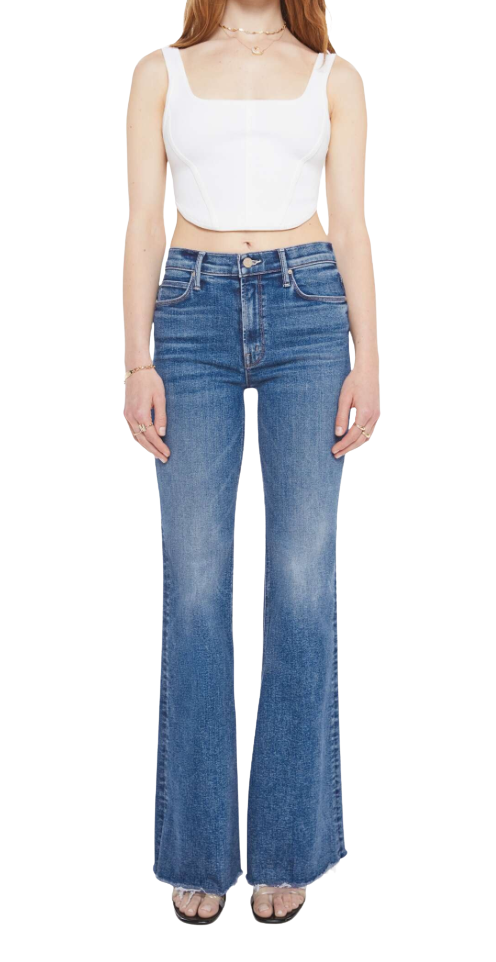 Hit the road. A high-rise flare with a zip fly, long 32-inch inseam and a frayed hem. Cut from stretch denim, Let's Split is a mid-blue with whiskering and fading at the knees.