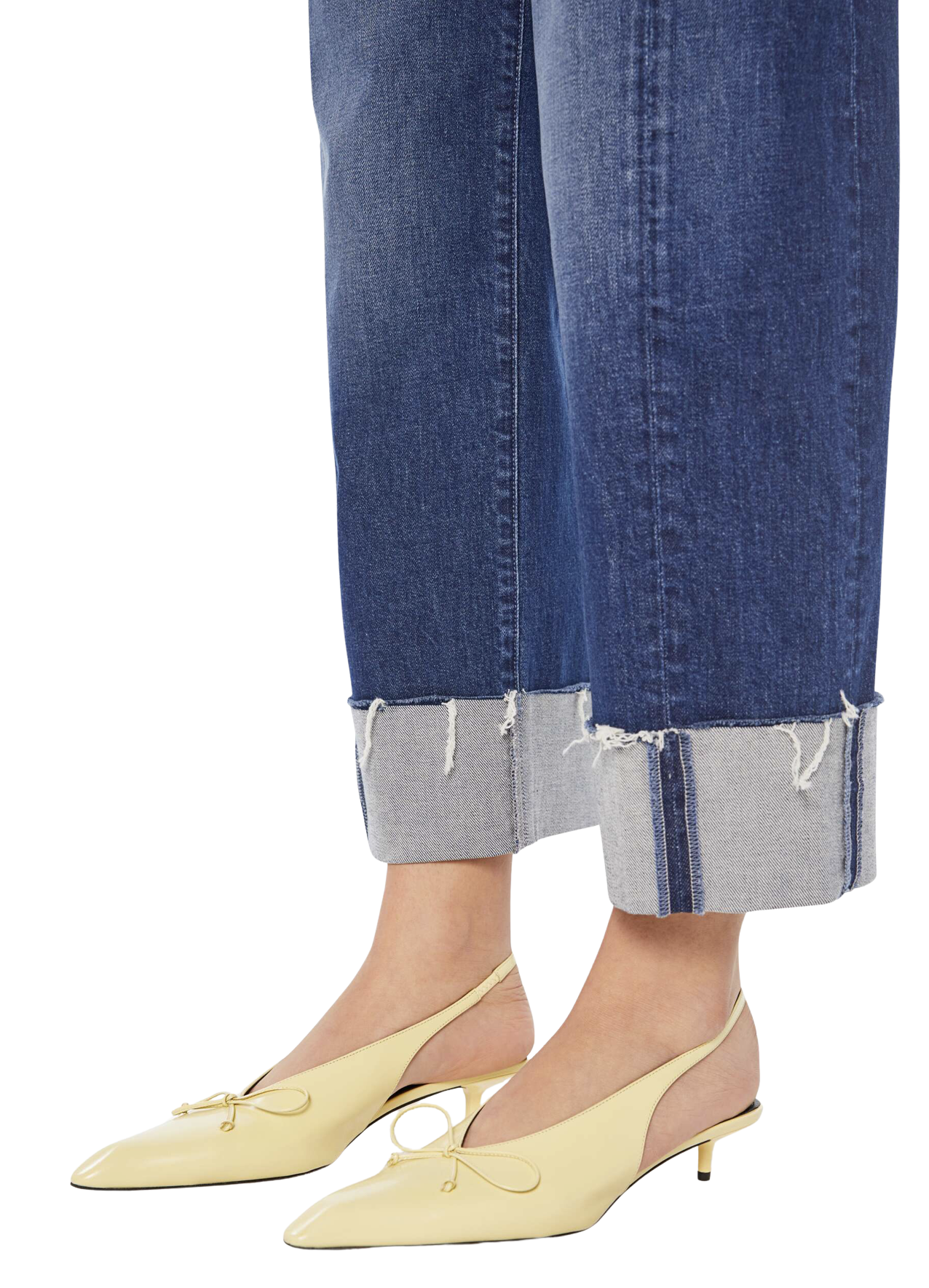 A super high-waisted barrel jean with a zip fly, wide, curved leg and an ankle-length inseam with a cuffed, frayed hem. Made from semi-rigid SUPERIOR denim, Perfectly Imperfect is a dark blue with whiskering and fading at the knees.