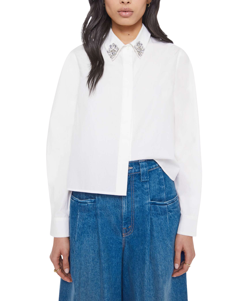 A twist on the classic button-up with long sleeves, a hidden button panel and a cropped fit. The Honor is made from 100% cotton in white with an embellished collar.