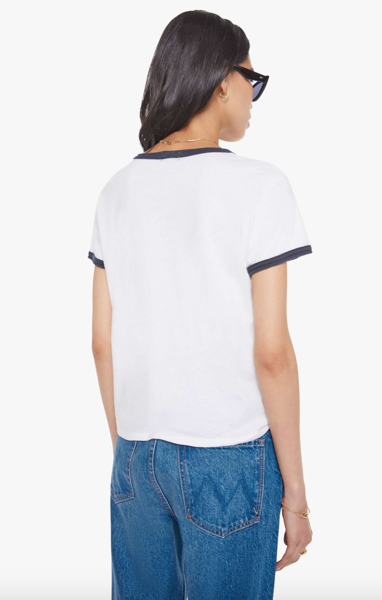 Born to ride. A crewneck tee with short sleeves and a slightly shrunken fit. Made from a recycled cotton blend in white with navy trim, the tee features MOTHER's name on the front.