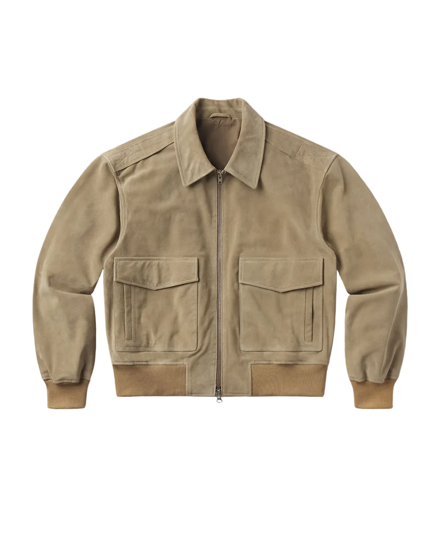 Looks Like: Medium to light suede bomber jacket with double front pockets
