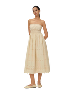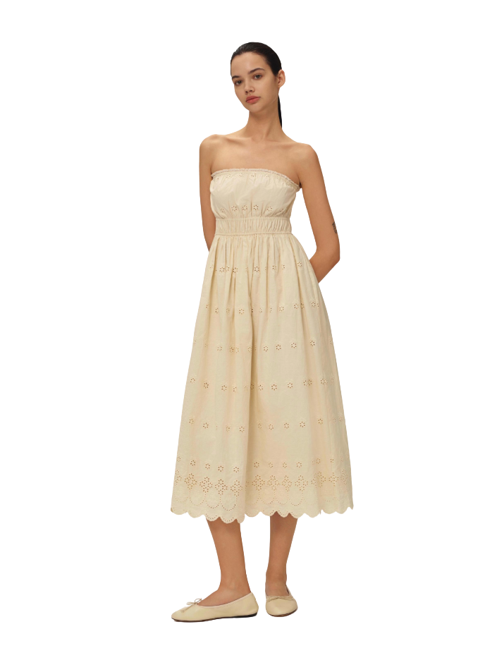 100% cotton eyelet stapless dress in ivory. Empire waist and scalloped edges make it special.