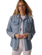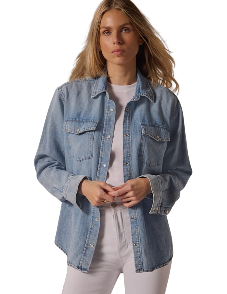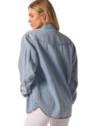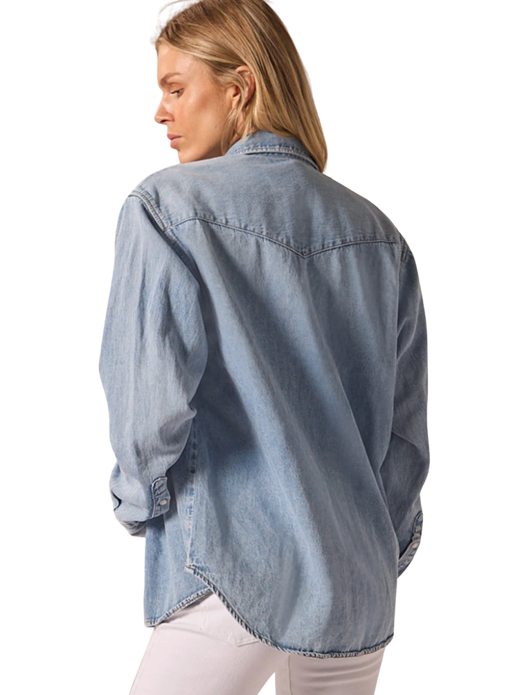This oversized Western shirt is the perfect blend of comfort and style. Crafted from a soft 50% cotton and linen chambray, it offers a buttery feel and a vintage, worn-in look. Authentic mother-of-pearl snaps add a touch of authenticity, while the length hits just below the butt for a flattering silhouette. Versatile enough to wear to and from the gym, yet sexy enough for dinner—this shirt effortlessly transitions from casual to chic with ease.