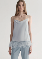 The Eliza Top is your go-to going-out top with a bold twist. Cut from Japanese crepe-backed satin, the subtle cowl neckline and feather detailing bring texture and movement, making it equally bold worn alone, under an oversized blazer or layered beneath a crewneck sweater for playful detail. This is your modern essential with a touch of drama.