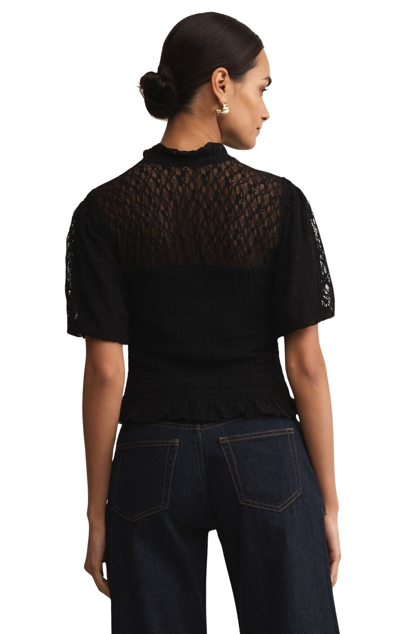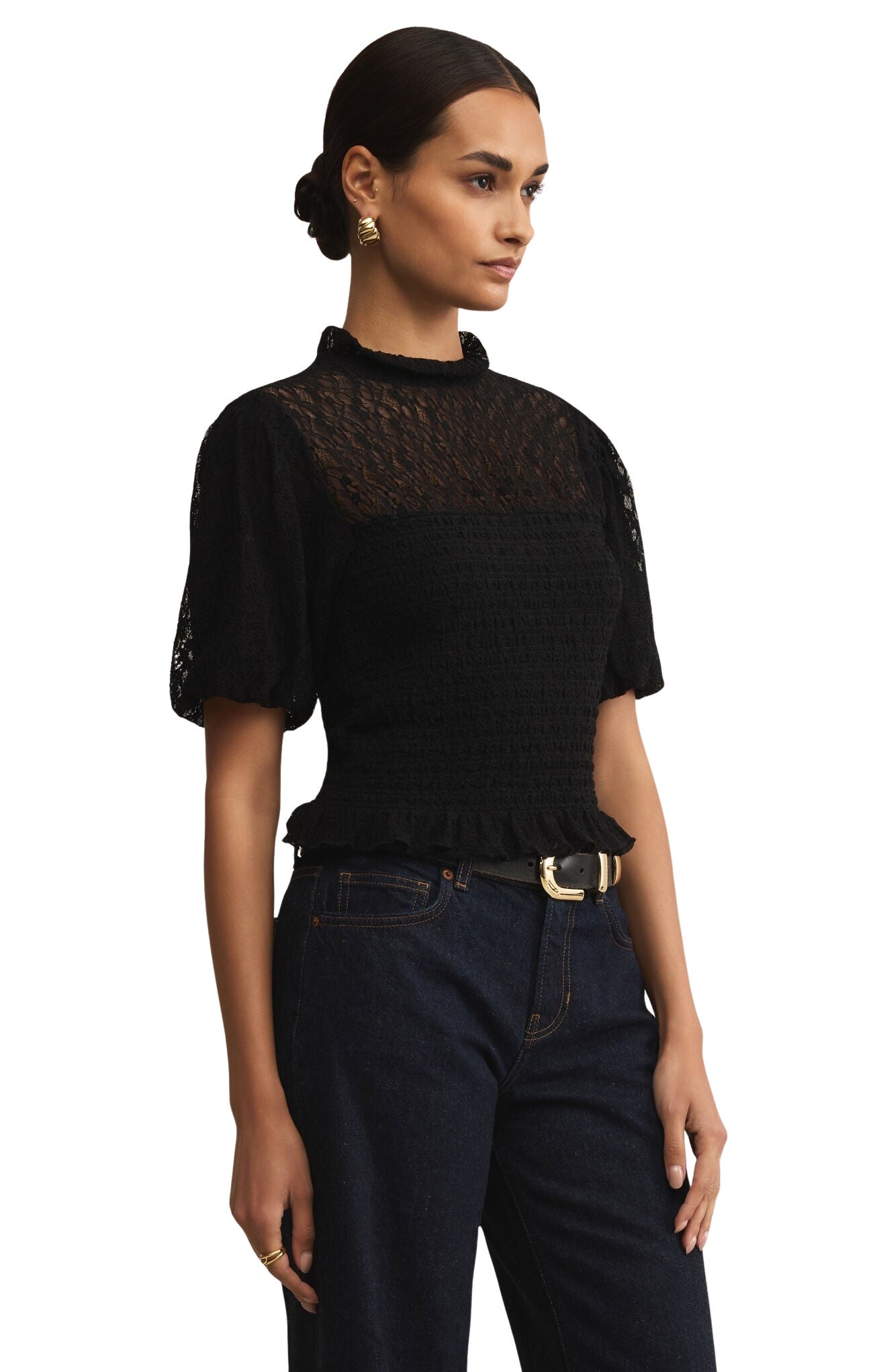 Soft lace and mesh lined puff sleeves meet a smocked bodice that flatters with just the right amount of stretch. Finished with a subtle ruffle hem and delicate shirring, it’s the romantic-meets-modern top you’ll reach for again and again.