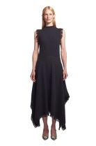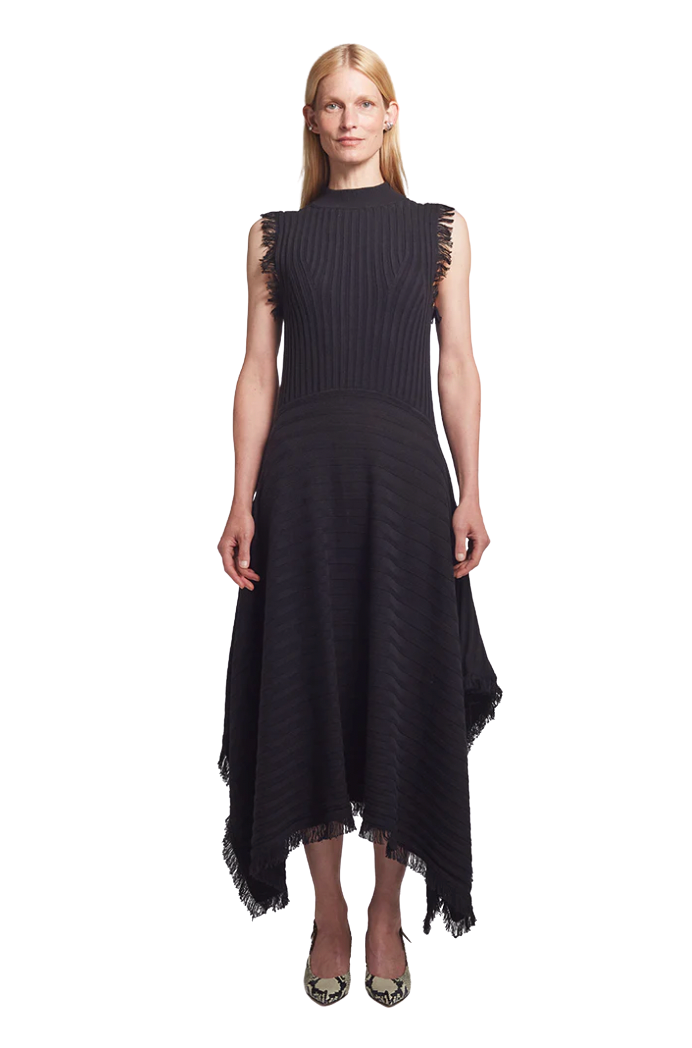 Hanna is a tank dress with mock-neck and a handkerchief hem and fray fringe hem detail that is dressy and dramatic in classic black. The dress is made in a wide flat rib stitch with plaited elastane for recovery. Hanna is a perfect for an occasion or holiday-dressing when you want to be sleek yet effortlessly pop-on-and-go.