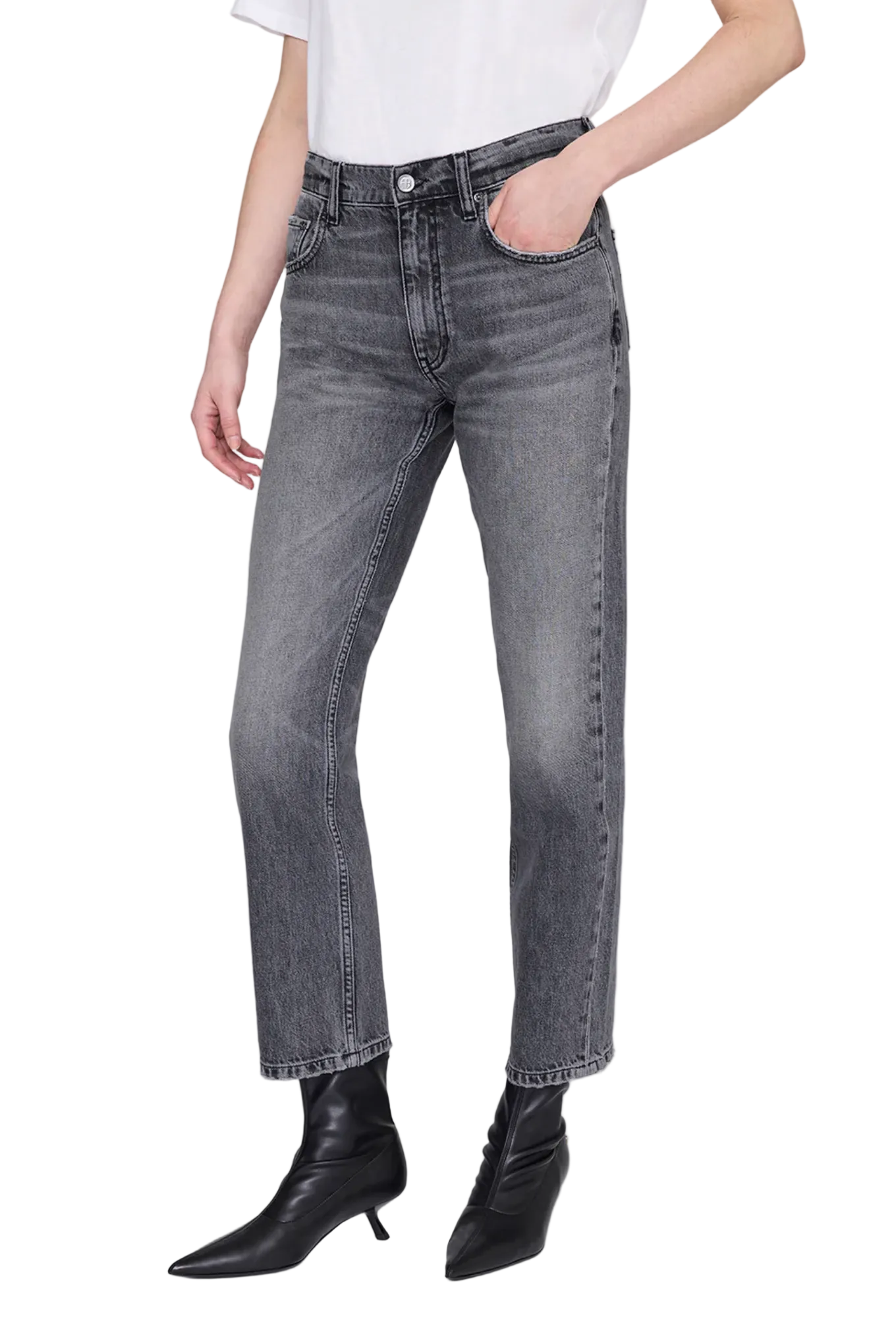 A timeless denim staple reimagined with subtle edge. The Kate Jean by Anine Bing in Grey offers a modern take on everyday denim. Crafted from midweight, rigid regenerative cotton denim with an authentic, structured feel that softens over time, the Kate Jean is finished in a washed grey with vintage-inspired grinding and light abrasion. This straight-leg silhouette offers a perfectly worn-in look while maintaining clean, modern lines. Designed to sit comfortably at the mid rise with an ankle-length inseam, this essential is an effortless everyday style that pairs seamlessly with everything from crisp shirting to relaxed knits.