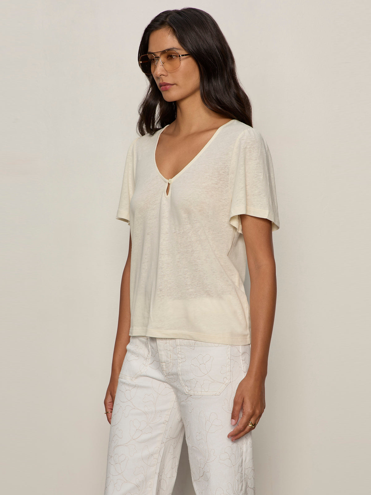 The Keyhole Flutter Tee by Sanctuary is an easy everyday piece with a subtle romantic touch. Designed with soft flutter sleeves and a delicate keyhole detail, it offers movement and lightness while maintaining a clean, wearable silhouette.