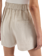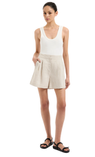 The Thilda Tailored Short in natural is made 100% linen which has been washed for a soft, breathable hand feel. The silhouette is a classic tailored shape worn high on the waist and relaxed through hip and leg. Features include a functioning fly front, elasticated on the back waistband and front pleats.