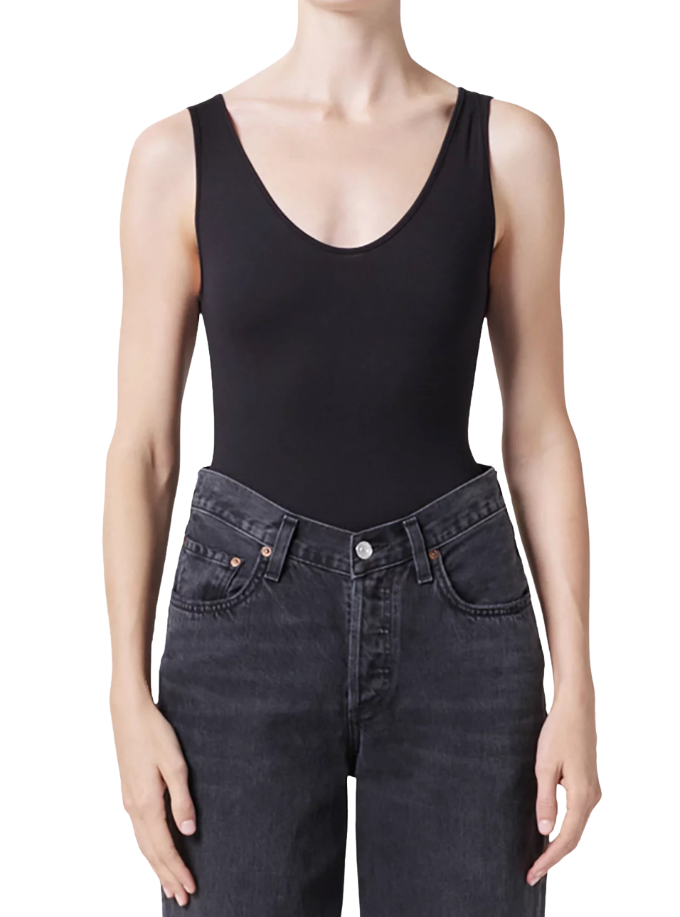 The Tora is a form-fitting tank bodysuit crafted from AGOLDE's signature second-skin fabric, offering a sleek, streamlined silhouette that molds to the body. With its minimalist design, featuring a classic crew neckline, this bodysuit is perfect for layering or wearing solo. The smooth, breathable fabric ensures comfort while its flattering fit pairs effortlessly with high-waisted jeans or skirts for an elevated, everyday look.