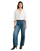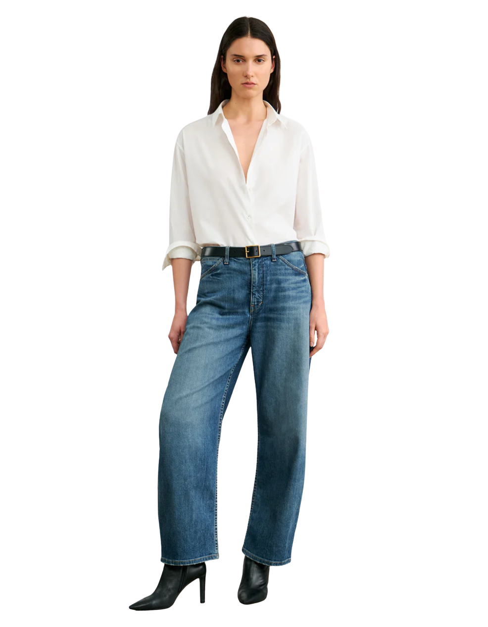 Mid-rise jean. Curved silhouette. Belt loops. Front slant pockets. Coin pocket detail. Zip fly. Shank closure. Back patch pockets with topstitching.