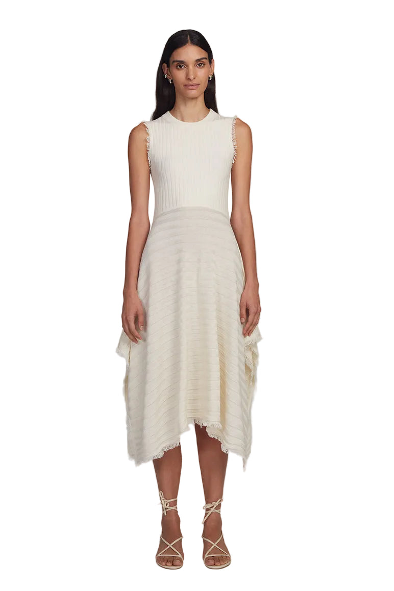 The Khloe Dress is a sleek, slim-fit to the waist tank silhouette with a crew neckline and a deep V-neck keyhole open back. A handkerchief hem, finished with frayed fringe, moves beautifully with every step—dramatic yet refined. Rendered in classic Pearl, the wide flat rib stitch is plaited with elastane for gentle structure and effortless ease. Designed for candlelit evenings and sun-warmed escapes alike, Khloe delivers understated allure with an easy pop-on-and-go sensibility.