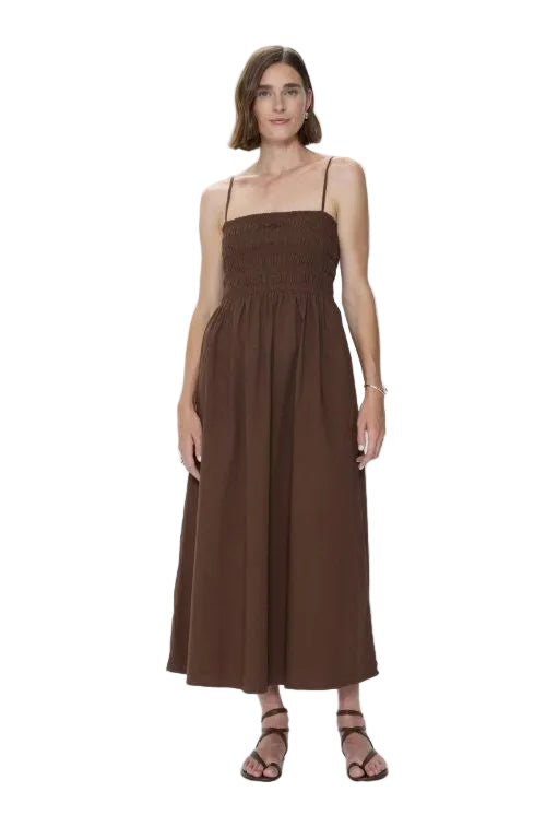 Sweet treat. Breezy day dress crafted from a flowing, lightweight fabrication designed for warm weather wear. Smocked bodice with ruched design details, topped with adjustable shoulder straps.