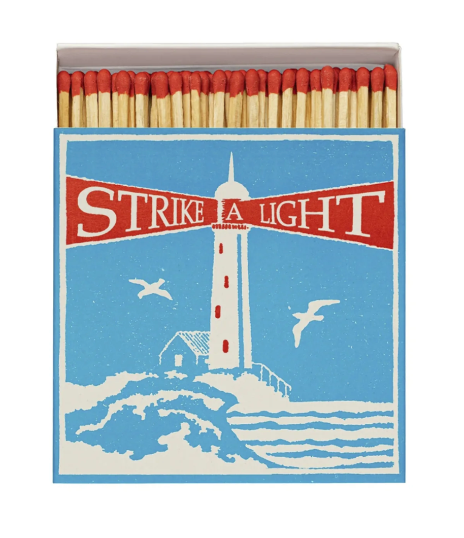 A summer themed letterpress match box filled with red tipped wooden matches, this box features a lighthouse with waves crashing below it.