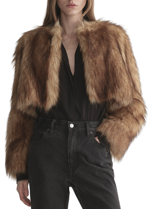 The Gina Jacket reimagines faux fur for holiday dressing. Crafted from the highest-quality faux fur with textural richness reminiscent of long-haired red fox, this cropped, shrunken silhouette brings lightweight volume and modern edge. Designed to replace a traditional evening stole, it pairs effortlessly over dresses—or with denim for a more unexpected, daytime mix. Finished with an open crewneck and grosgrain-covered hook closures, it’s a versatile piece that adds dimension and personality to any outfit.
