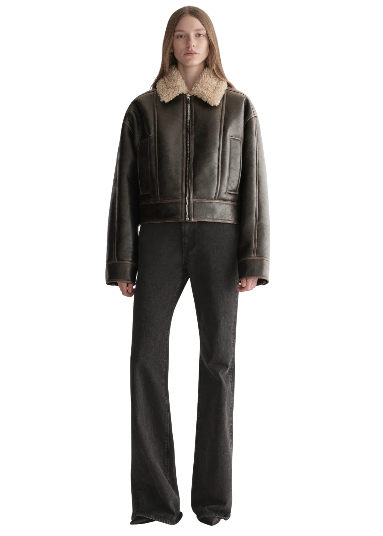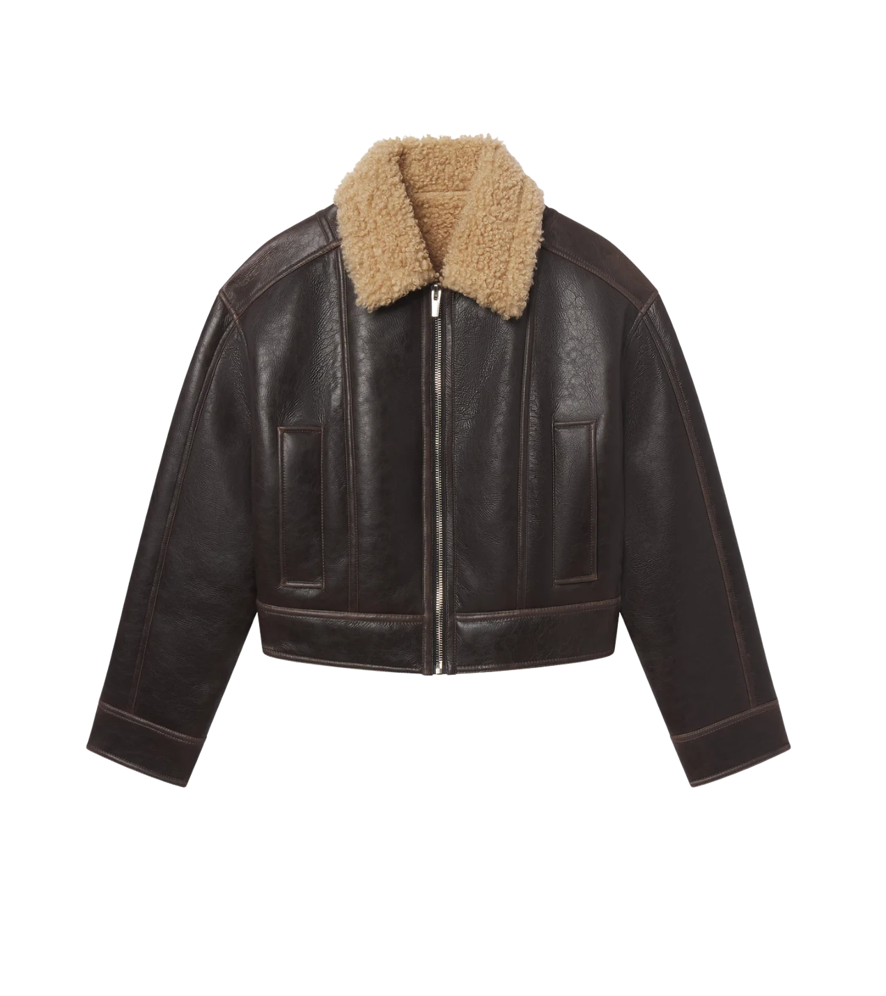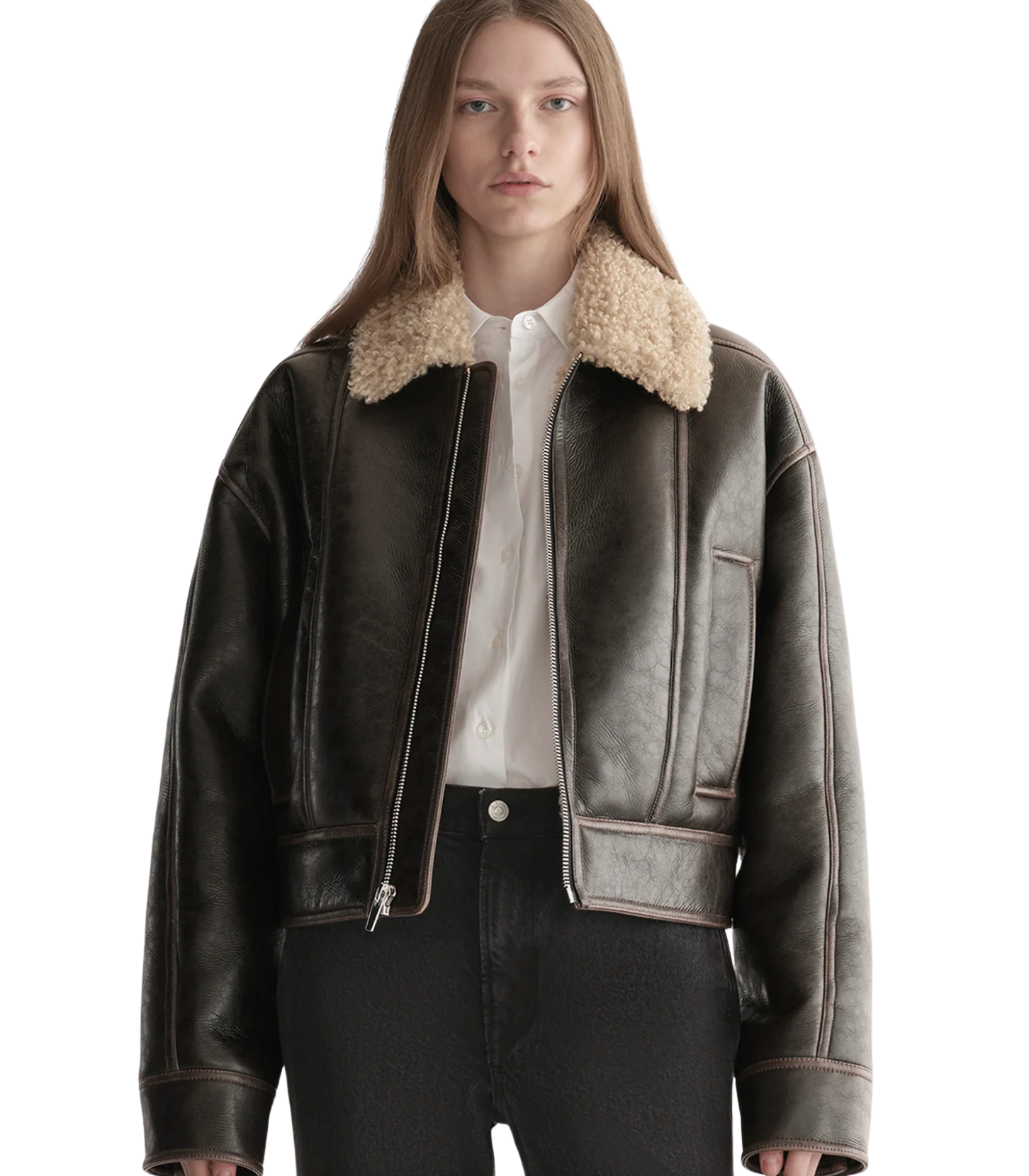 - Cropped faux-shearling silhouette with paneled seaming