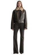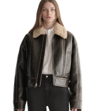 The Stevie Jacket blends modern structure with a plush, wintry feel. Crafted from buffed faux shearling in vintage-inspired deep brown, this cropped silhouette features an oversized shearling collar, paneled seaming, and wide cuffs that add subtle volume. A clean zip front and minimal detailing keep the look streamlined.