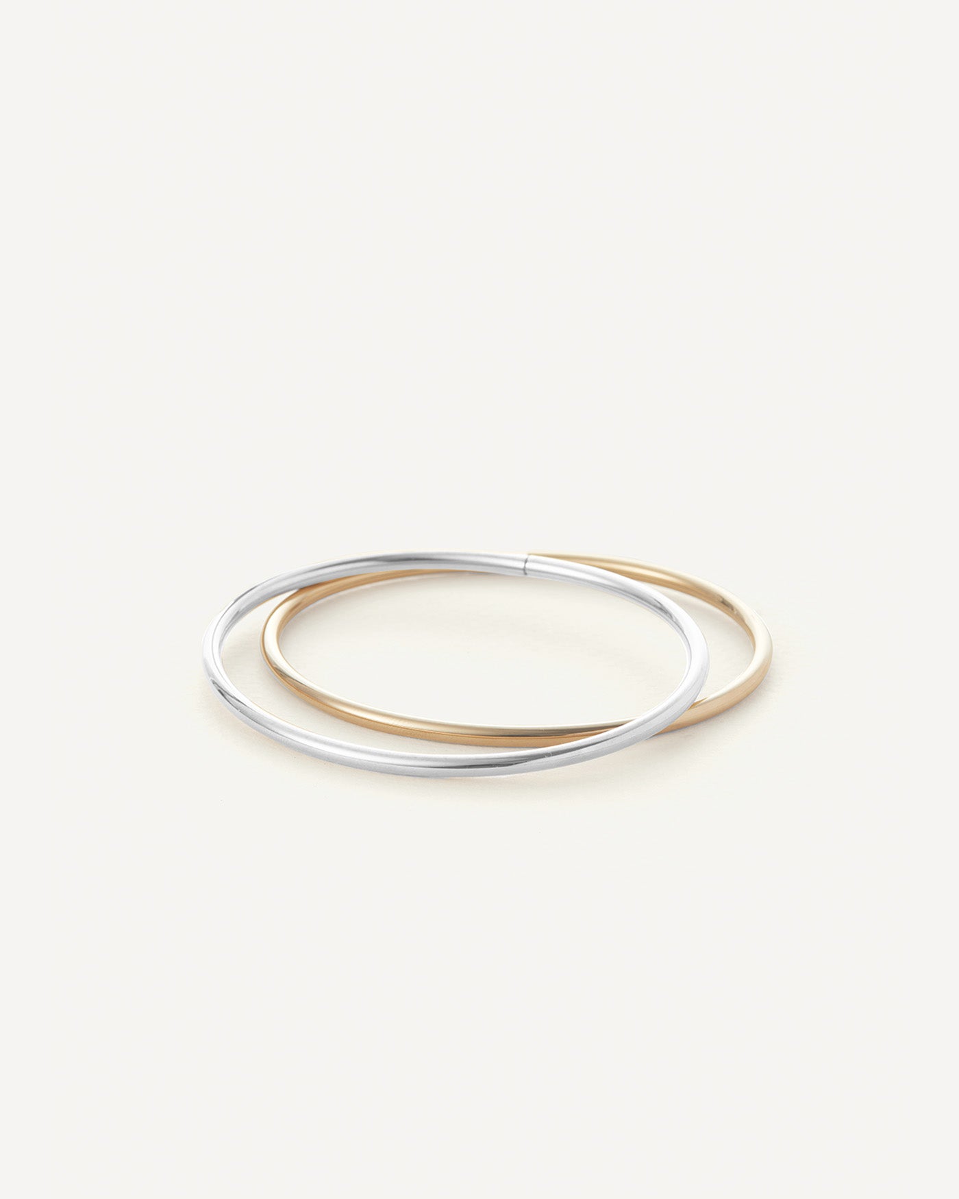 What lightweight stacking dreams are made of. Set of 2 or 5 high-shine gold bangle bracelets. This water-resistant design brings major impact to your stacking game with zero weight. The perfect piece to wear if you don’t intend to take it off. Finished in high-polish 14k gold.