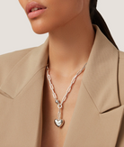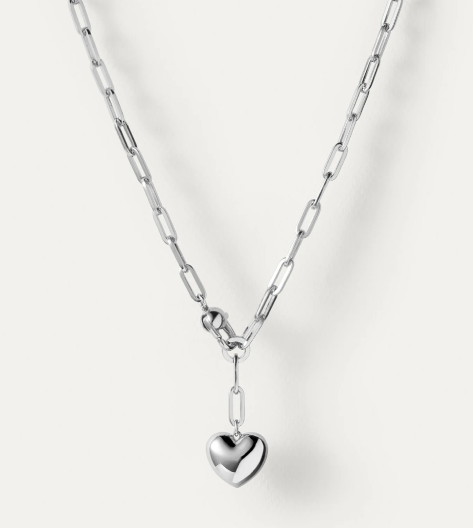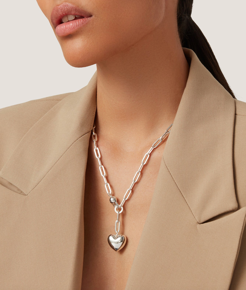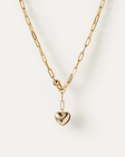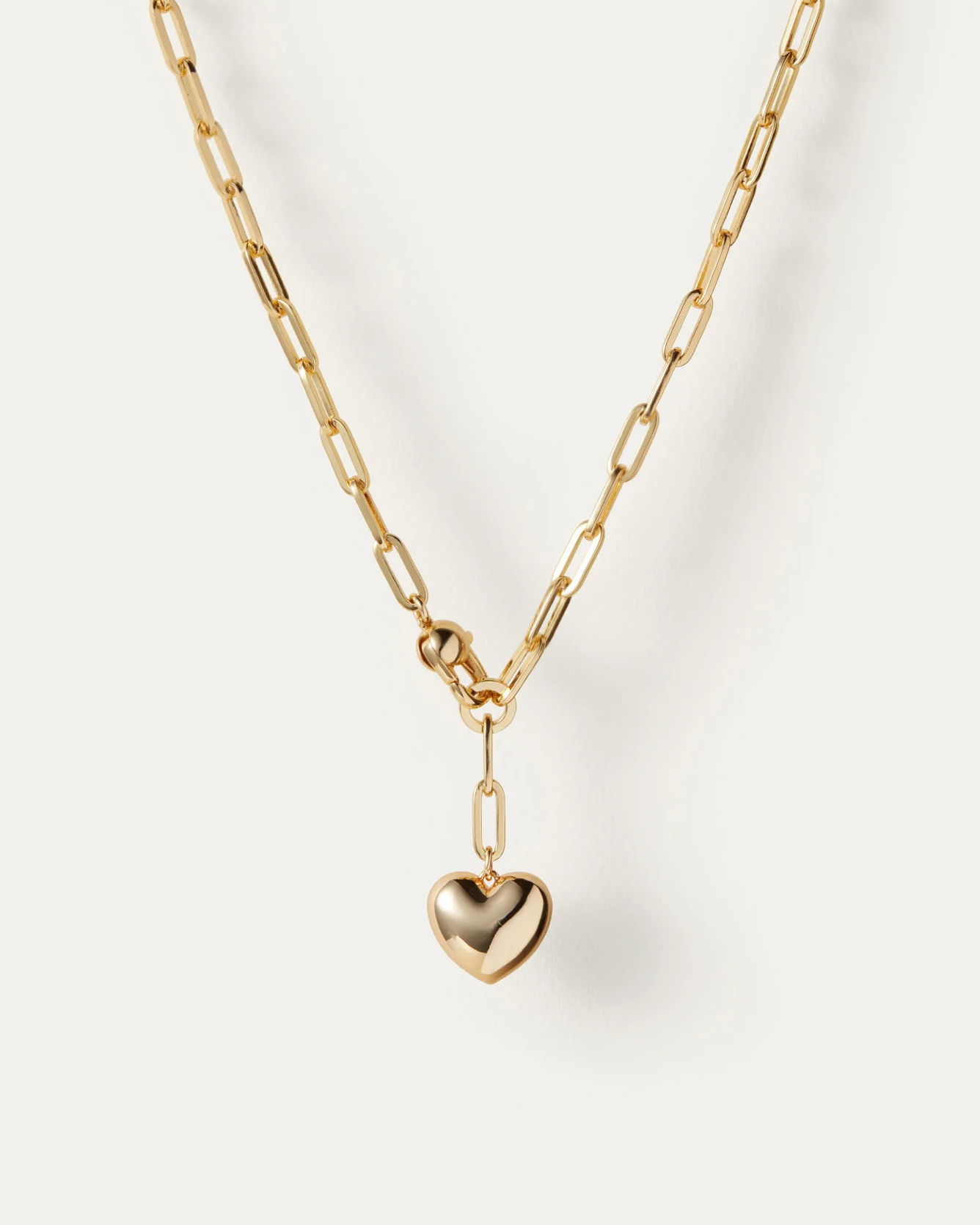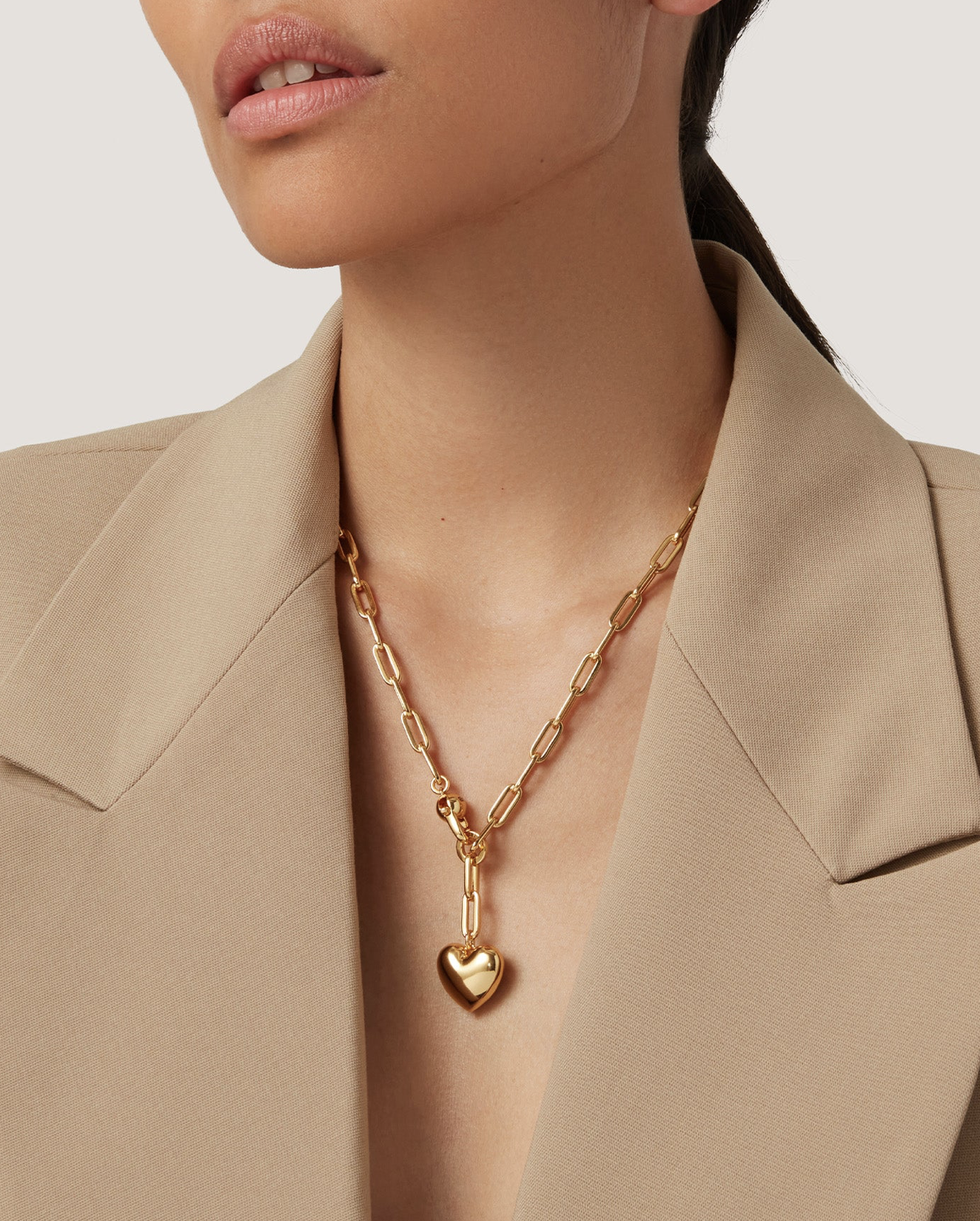 A joyful, inflated heart is suspended from a paperclip link chain necklace. Finished in high-polish gold.