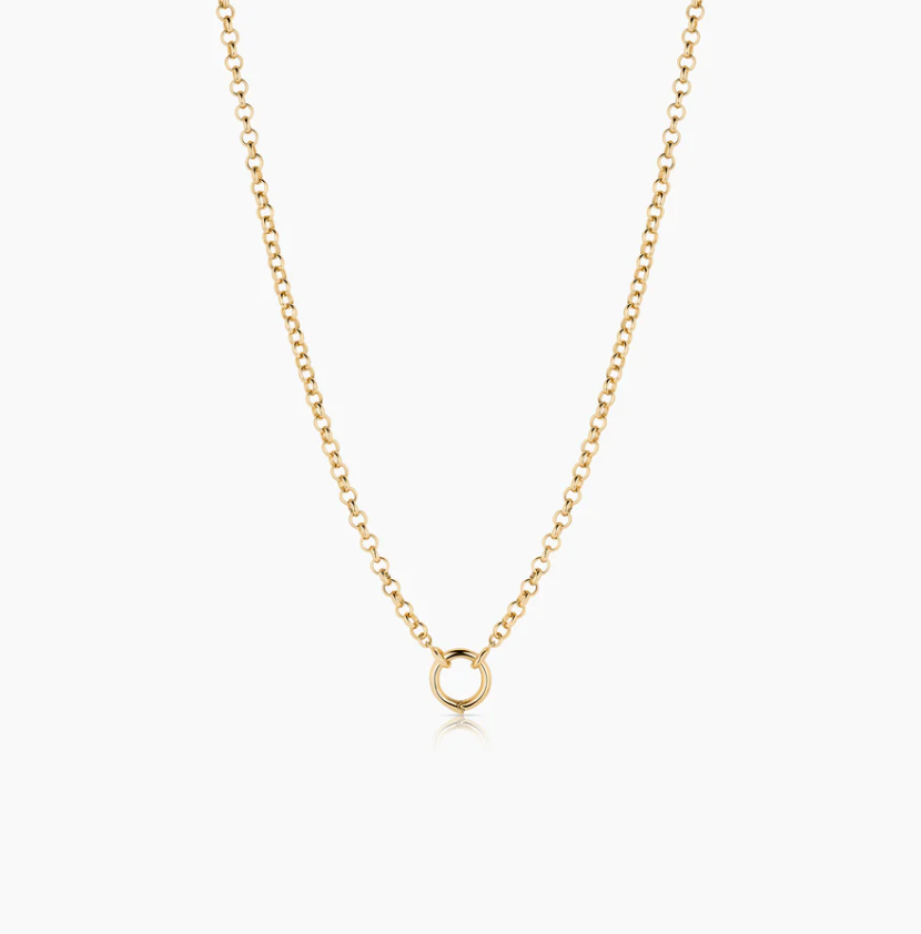 14k gold or rhodium plated 3mm rolo chain necklace with center hinge opening for interchangeable charm styling. Available in multiple sizes.