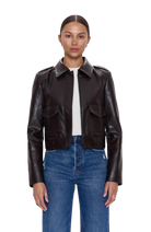 A modern update to the classic leather jacket, Bex is cut with a cropped, shrunken fit that delivers edge without bulk. Designed with a sharp collar, front flap pockets, and sleek lines, it’s crafted from buttery soft alternative leather in French Roast, a deep brown with rich sheen, for a finish that feels both polished and cool.