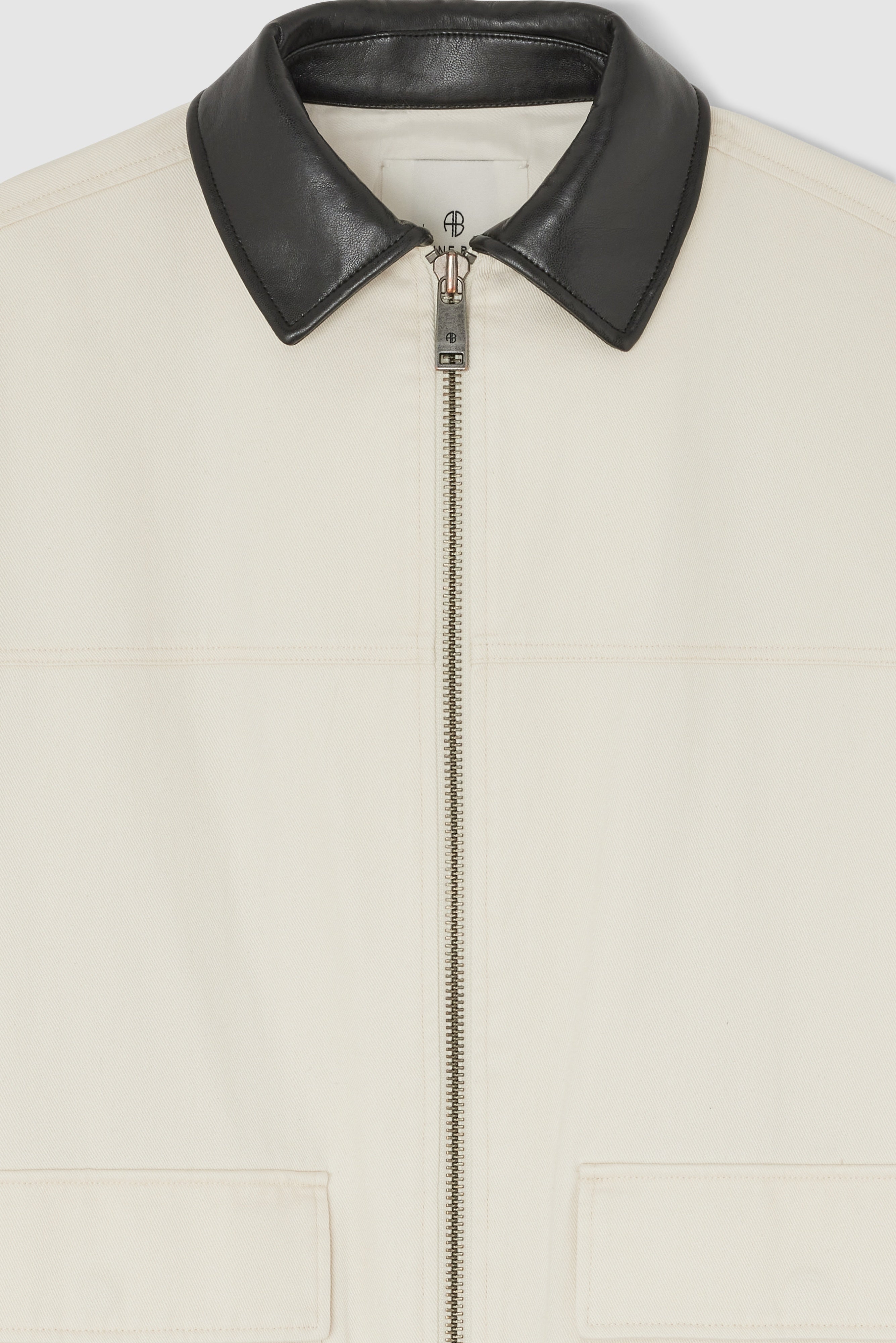 Cut from a smooth, structured fabrication, it features a sharp point collar in contrasting black, a full front zip closure, and oversized patch pockets for a utilitarian edge. The relaxed silhouette and dropped shoulders on the Holden Jacket lend effortless volume, while subtle tailoring keeps the shape refined. A versatile layer designed to balance polish with ease.