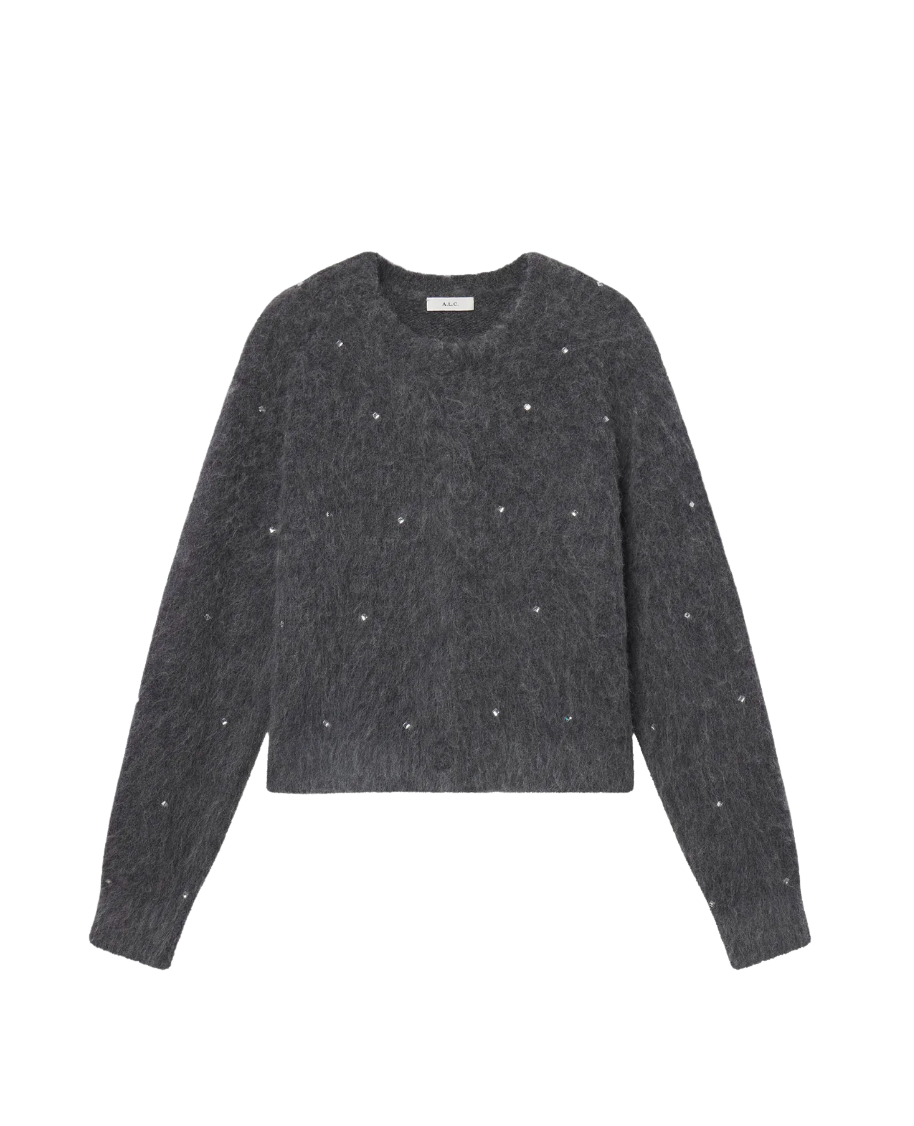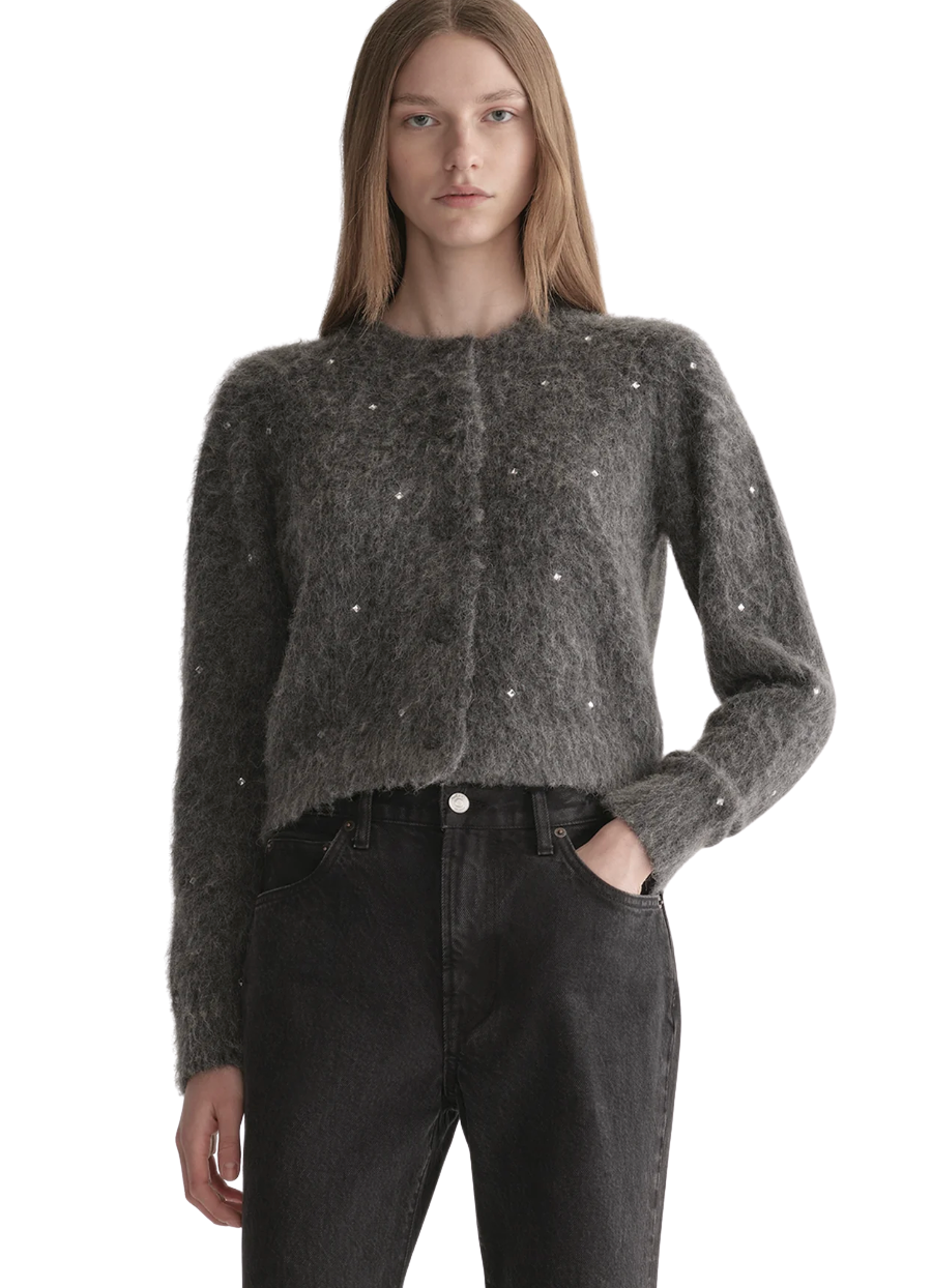 Soft brushed alpaca meets quiet sparkle in the Lainie Cardigan. Knit from brushed alpaca for a soft, airy feel, it’s accented with tonal rhinestones and finished with ribbed trims and a crew neckline. The classic crewneck shape makes it a polished layer for day or night—perfect worn closed or just barely unbuttoned.