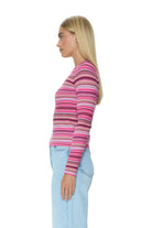 Balancing softness and structure, the pink and brown multi stripes lend a playful touch, creating a versatile piece that transitions easily from weekday to weekend.
