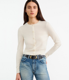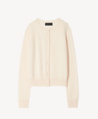Light to medium weight cardigan. Six button center front closure. Fully fashioned along neck, sleeve and arm hole. Center back signature cable knit detail.