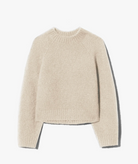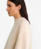 Heavyweight relaxed sweater. High, wide neck trim. Regular length body. Raglan arm hole. Fashioning along arm hole. Rib start at hem and sleeve. Signature center back cable knit detail.