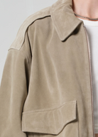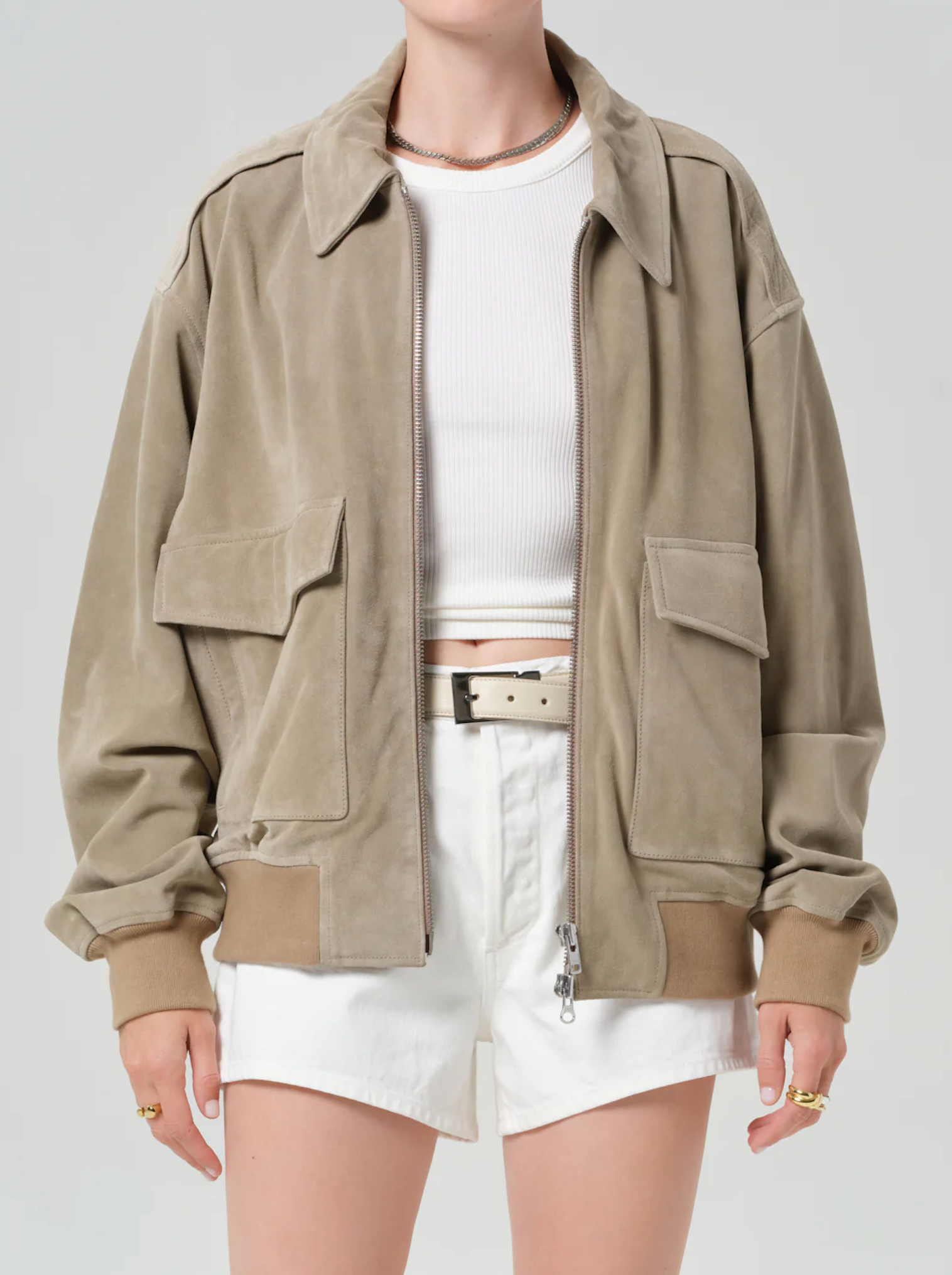 Looks Like: Medium to light suede bomber jacket with double front pockets