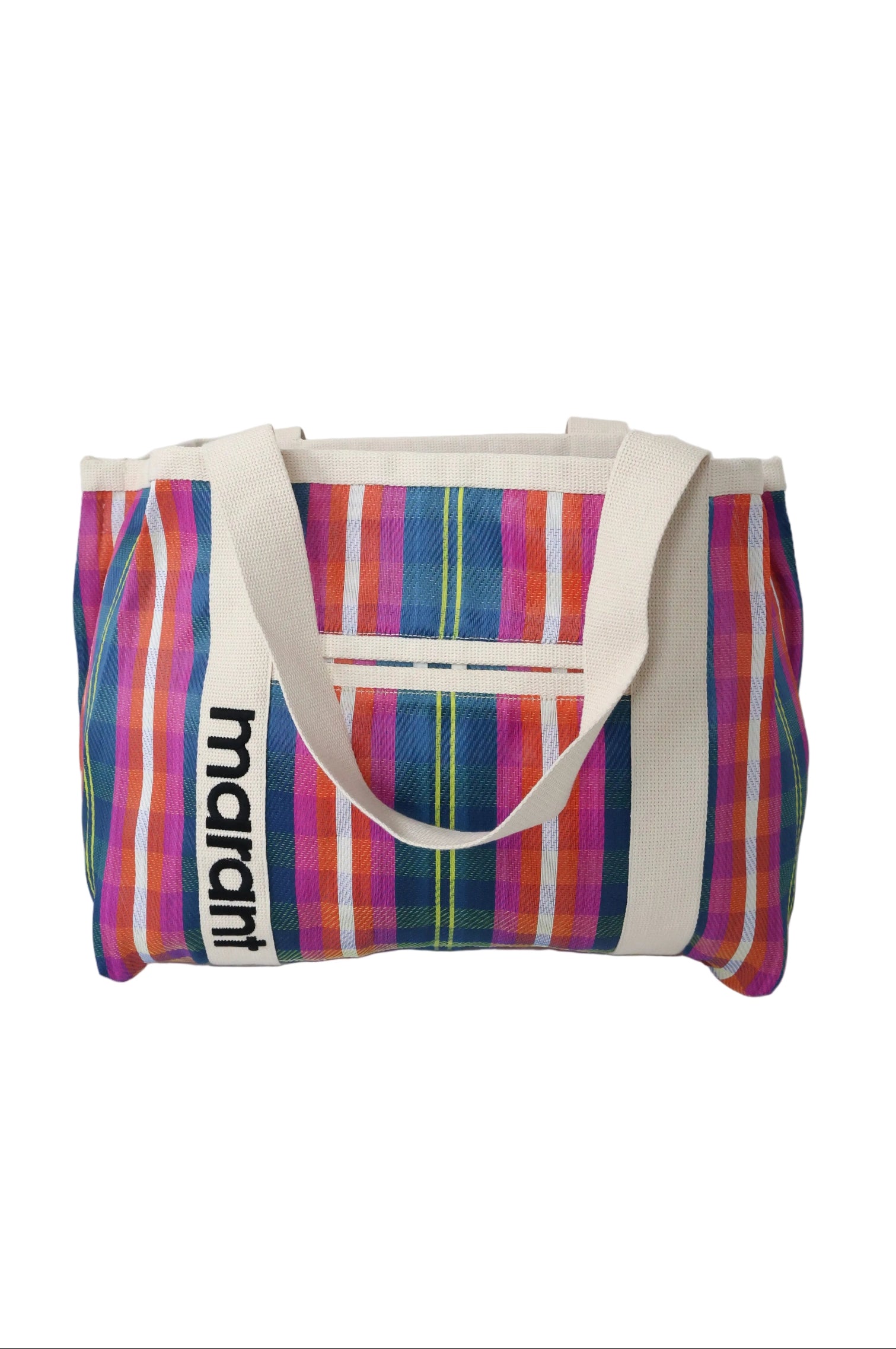 Large colorful tote by Isabel Marant, our favorite of the season. Mesh woven fabric makes it perfect for anything fun in the sun.