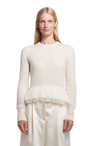 The Colette is a sweater that balances relaxed comfort with polished styling. Crafted in a modern wide flat rib-stitch, it offers a slim fit with some ease. The hem a playful two-tier fringed hem perfect fro holiday styling. Versatile and effortlessly chic,  Colette transitions seamlessly from day to night. The classic ivory—a timeless neutral—makes this dressy sweater staple you'll reach for again and again.