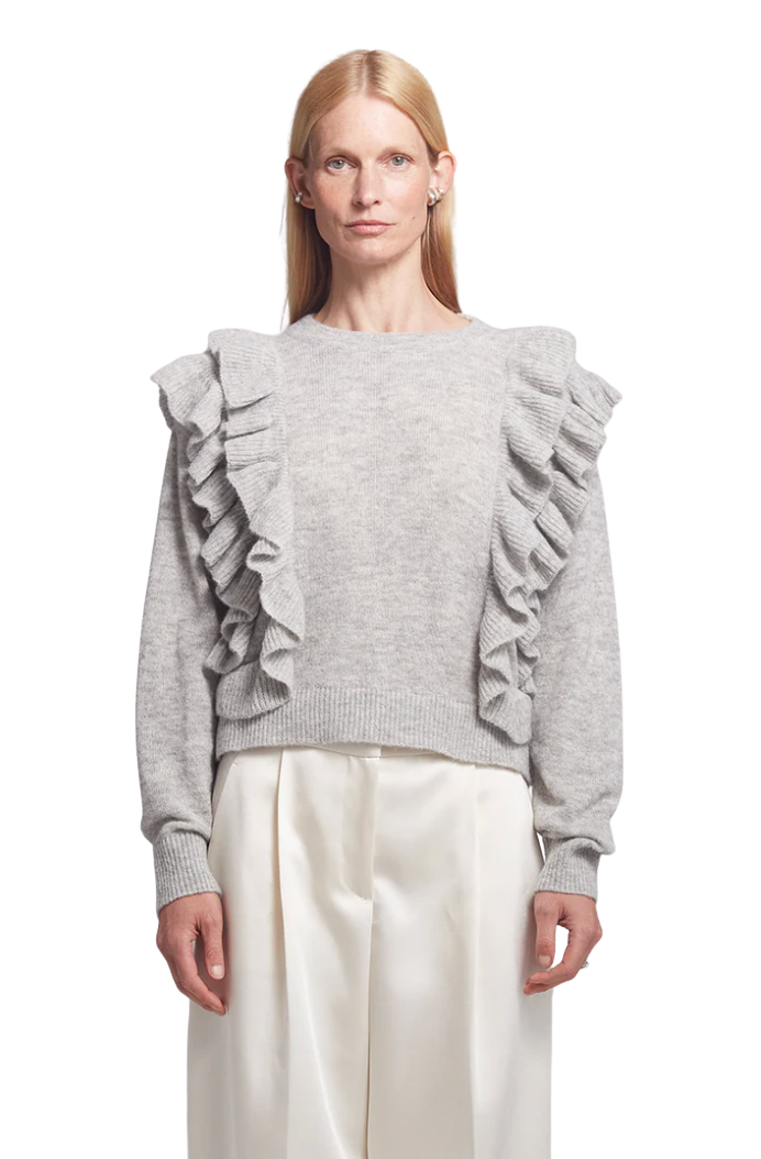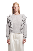 Elina is an emotional, must-have relaxed sweater with feminine yet relaxed  double ruffle detail placed on shoulder and side body. Knit with the softest air-spun alpaca yarn in a light weight jersey stitch. This piece can be styled in a relaxed or dressier way, whatever your mood!