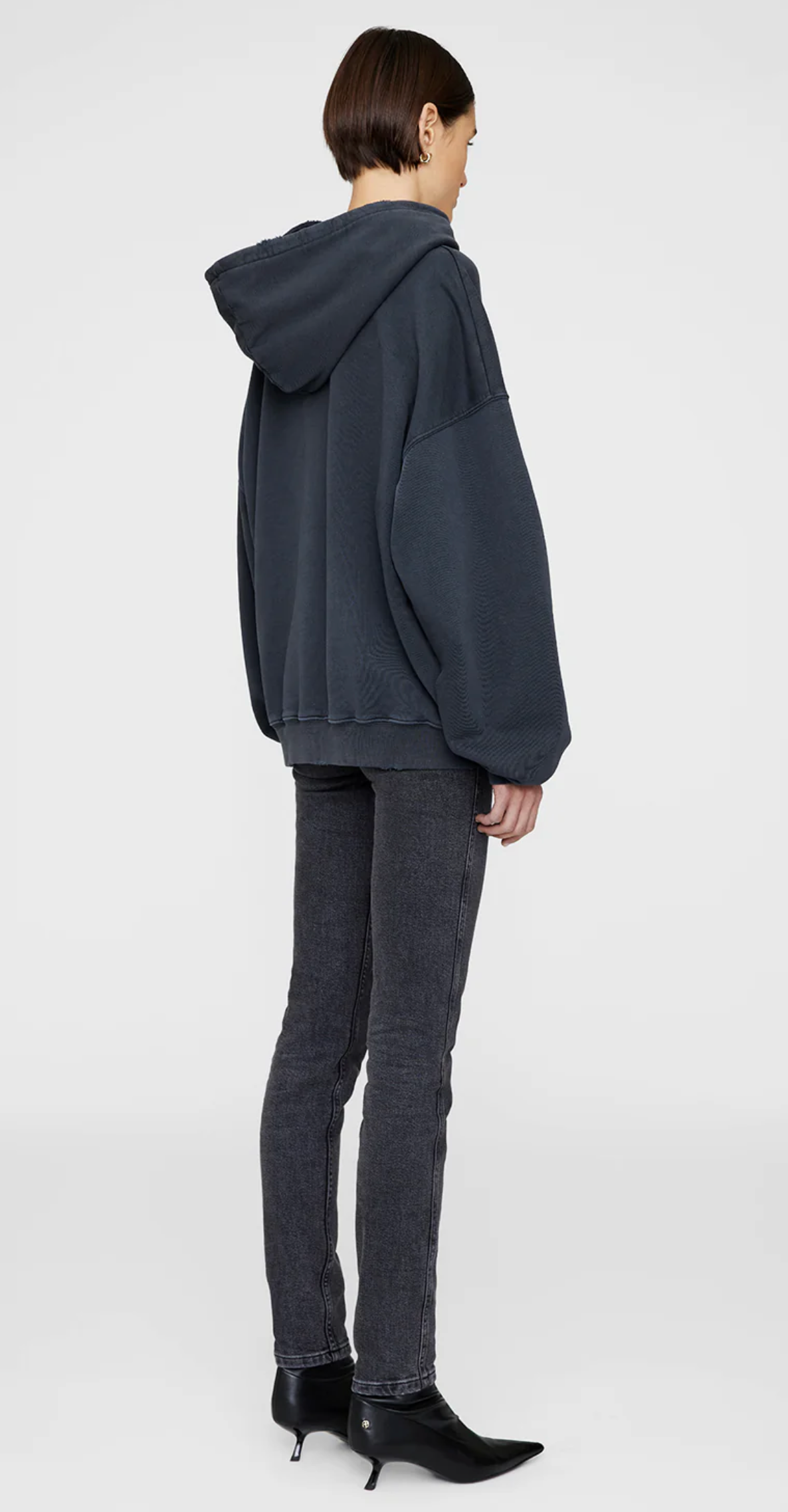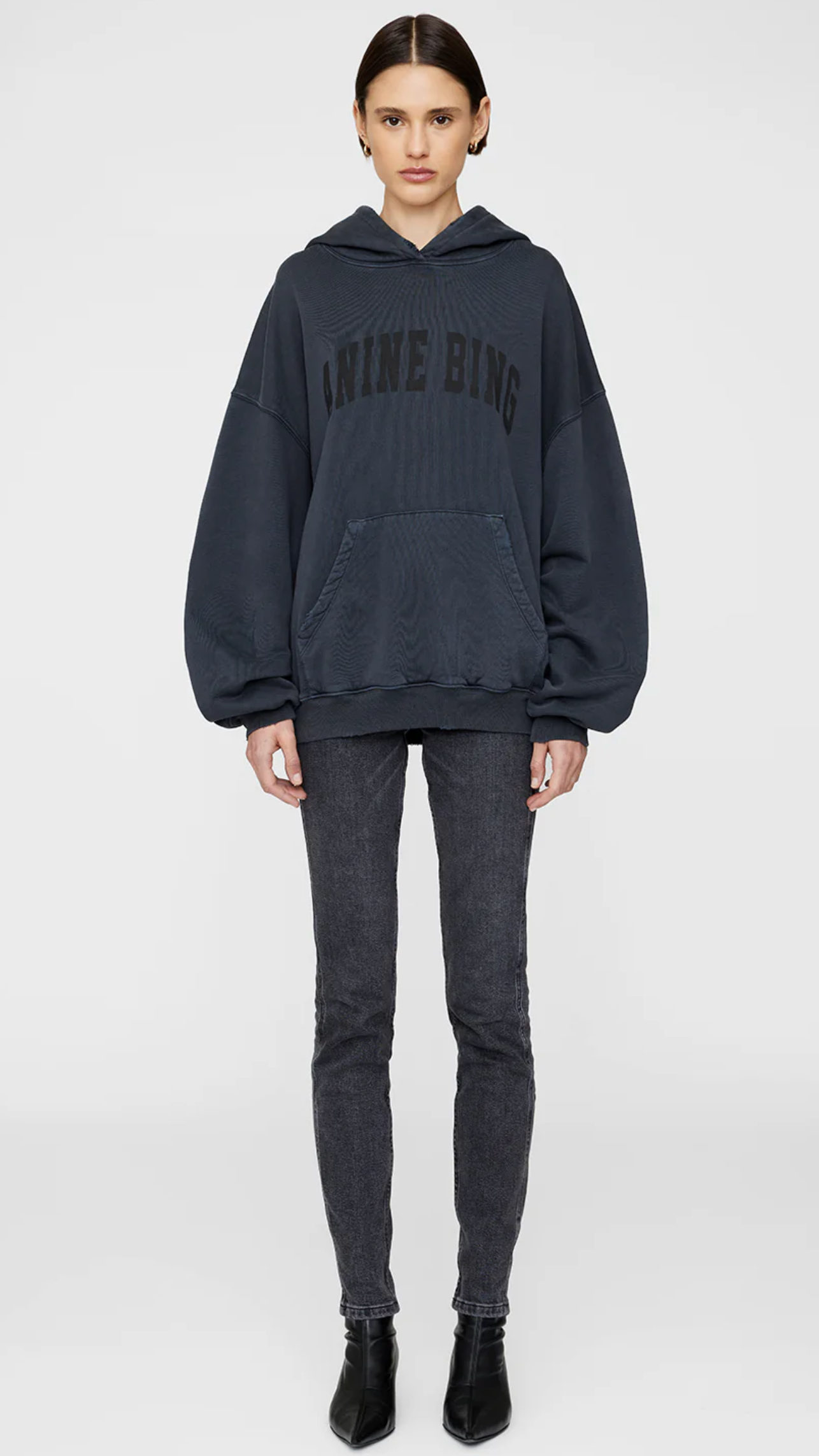 The Harvey Sweatshirt is an oversized hoodie made from midweight 100% cotton fleece. It features an ANINE BING Sport graphic at the chest in tonal collegiate lettering and subtle grinding along the edges of its hood, sleeve cuffs, and waistband for a vintage look. Includes a functional front kangaroo pocket.