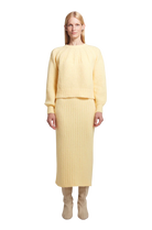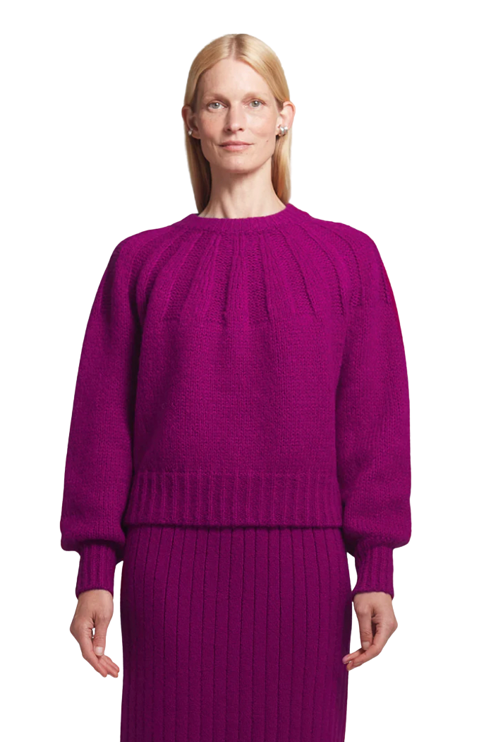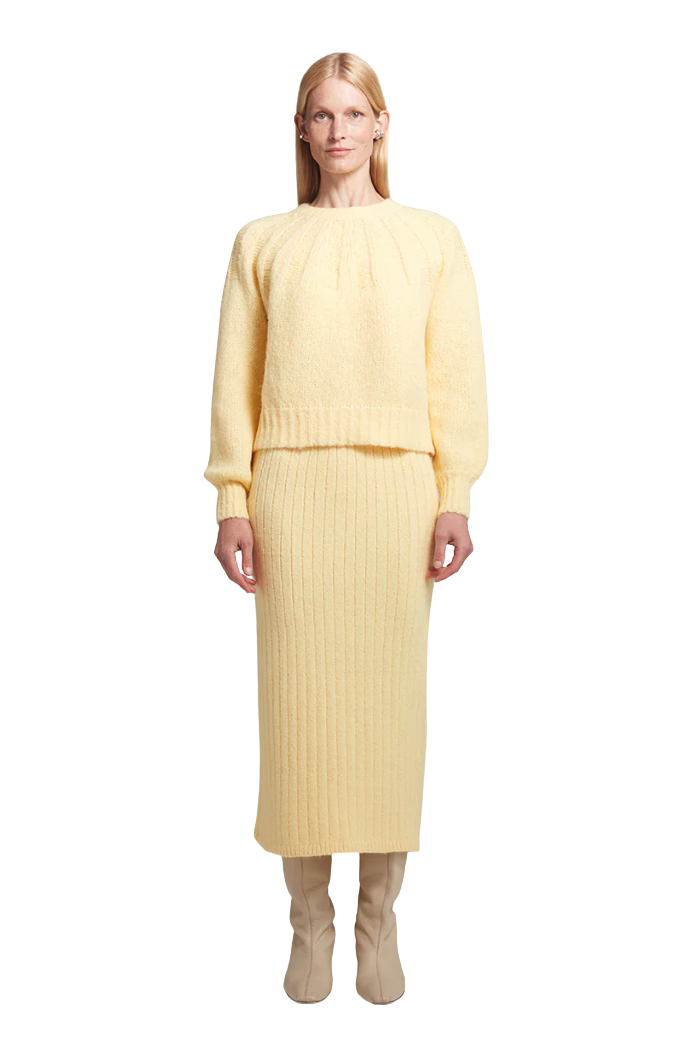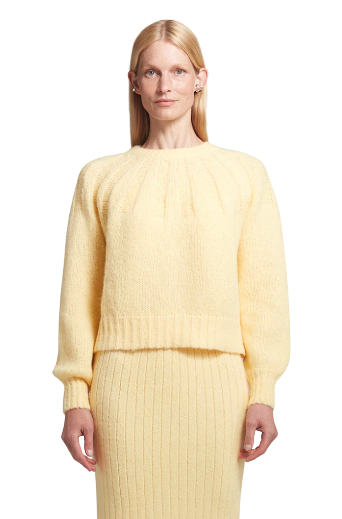 Mila is a relaxed fashion-staple sweater to pop-on-and-go with a feminine blouson-sleeve, a circular ribbed yoke and a slightly-cropped body-proportion, you can pair her back to a high-waisted pants perfectly, making you feel both refined, yet relaxed.