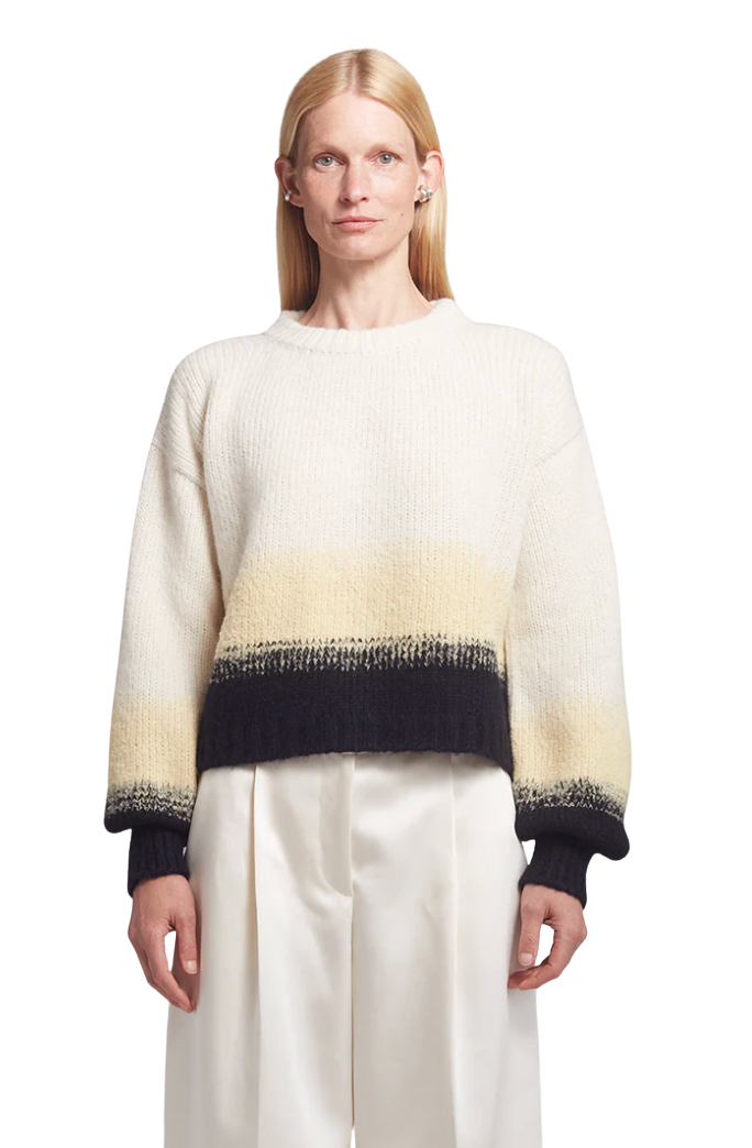 Sonia is an easy sweat-shirt style body with a feminine blouson-sleeve and slightly cropped, relaxed body-proportion. The graphic, color-block with ombre butter stripe makes for a striking yet relaxed piece.