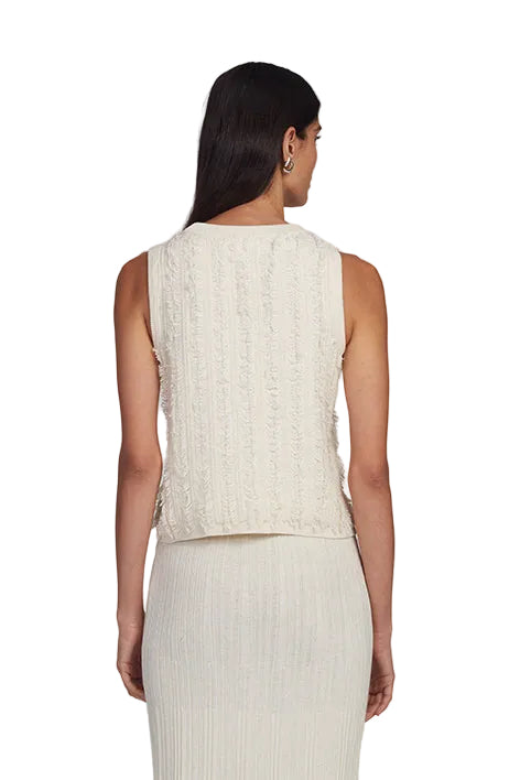 Lilia is a novelty sweater tank defined by quiet femininity and ease. Designed with a relaxed silhouette, it’s knit from a refined cotton–viscose yarn that feels soft yet polished against the skin. An allover textured linear fray-fringe stitch lends subtle movement and rich dimension, elevating the everyday knit into something distinctive. Effortlessly versatile,