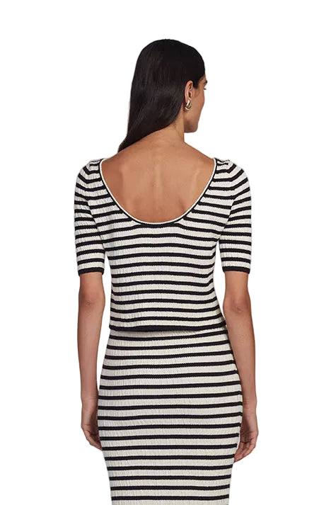 Nena is an effortlessly slim, cropped sweater-top designed to flatter with quiet confidence. Knit in a feminine seersucker texture stitch and rendered in a timeless stripe, it balances structure with softness. An elegant boat neckline frames the front, while a beautifully scooped back adds subtle allure—creating an easy day-to-night sensibility. Style Nena head-to-toe with the matching Carrie Stripe Skirt for a refined, coordinated knit look, or pair it back to tailored separates for a modern, versatile expression.