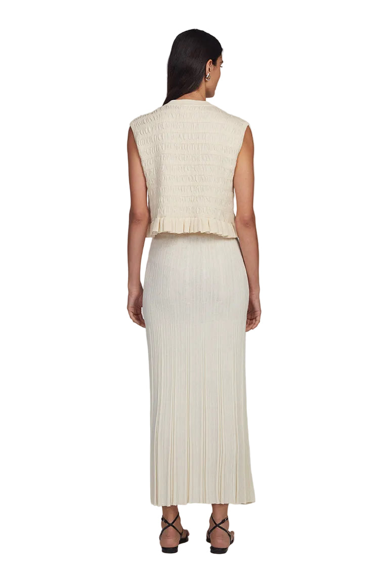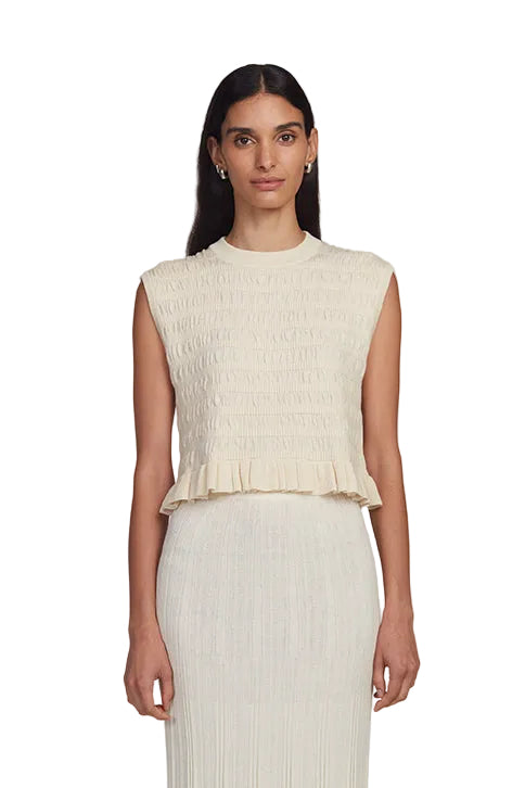 Tessa is a feminine sweater top crafted in a sleek cotton-viscose blend, featuring a modern textured seersucker stitch. A subtle ruffle hem adds a soft, feminine twist to its relaxed silhouette. Designed in a slightly cropped proportion, it pairs effortlessly with on-the-waist pants for a look that feels both refined and relaxed.
