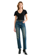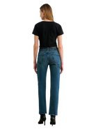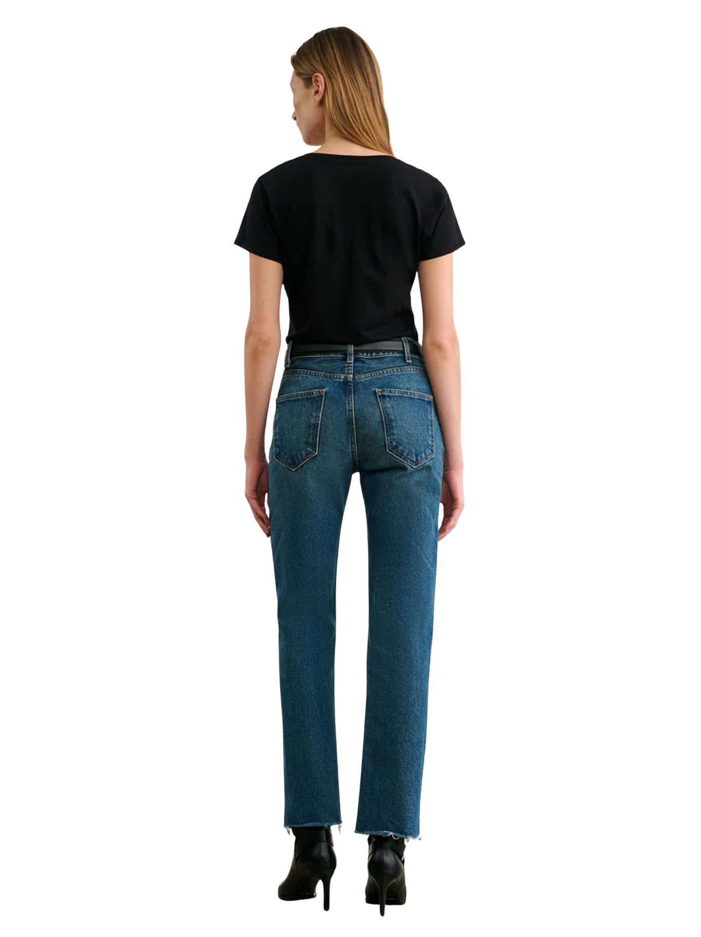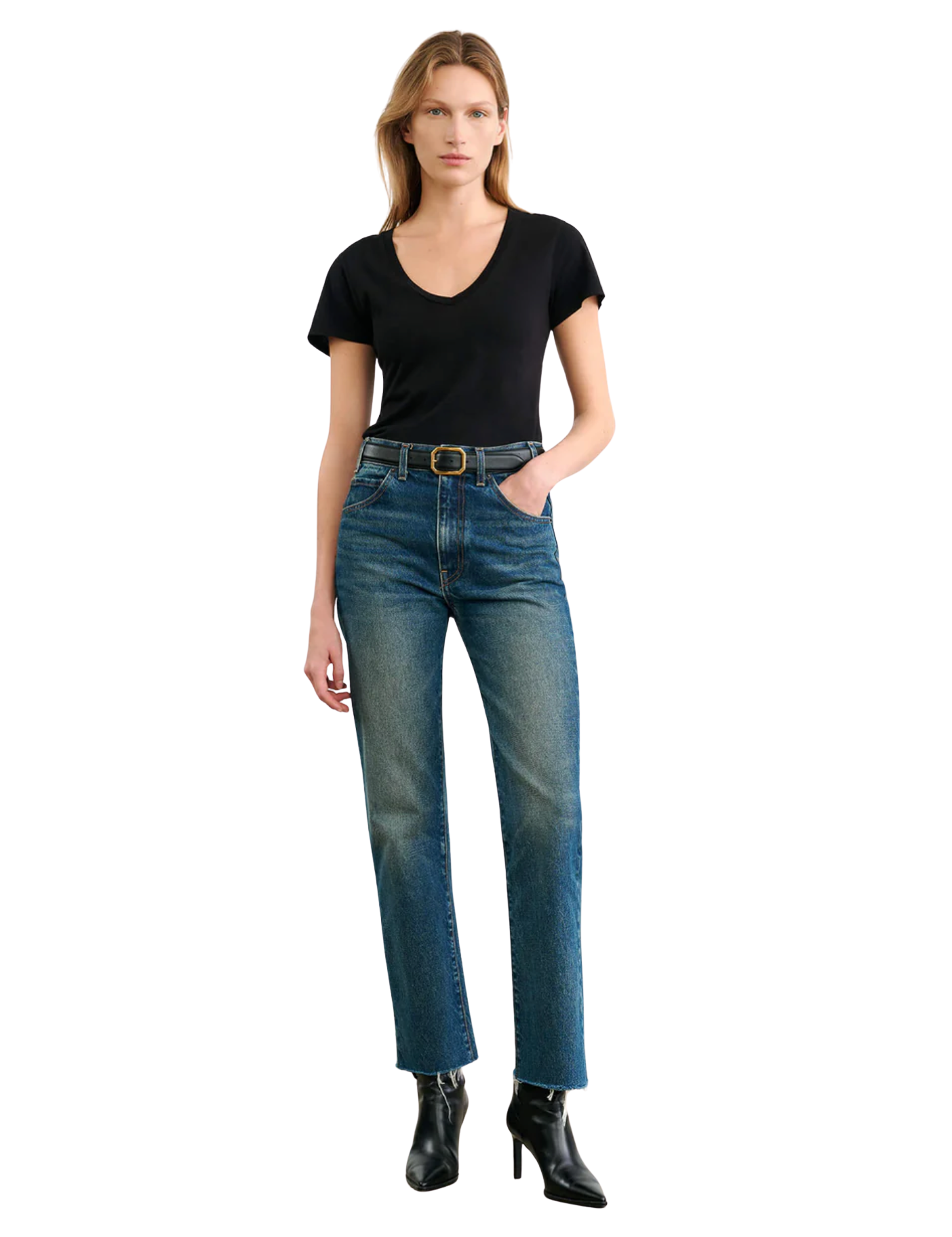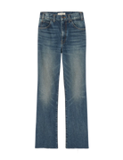 High-rise slim straight leg ankle length jean in Japanese non-stretch heavyweight crosshatch denim. Fitted through hips. Five pocket details. Zip fly. Shank closure. Belt loops. Raw hem.