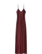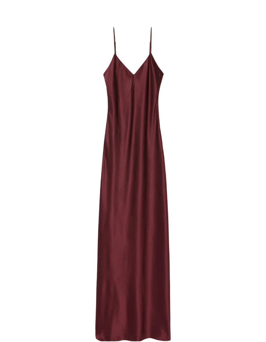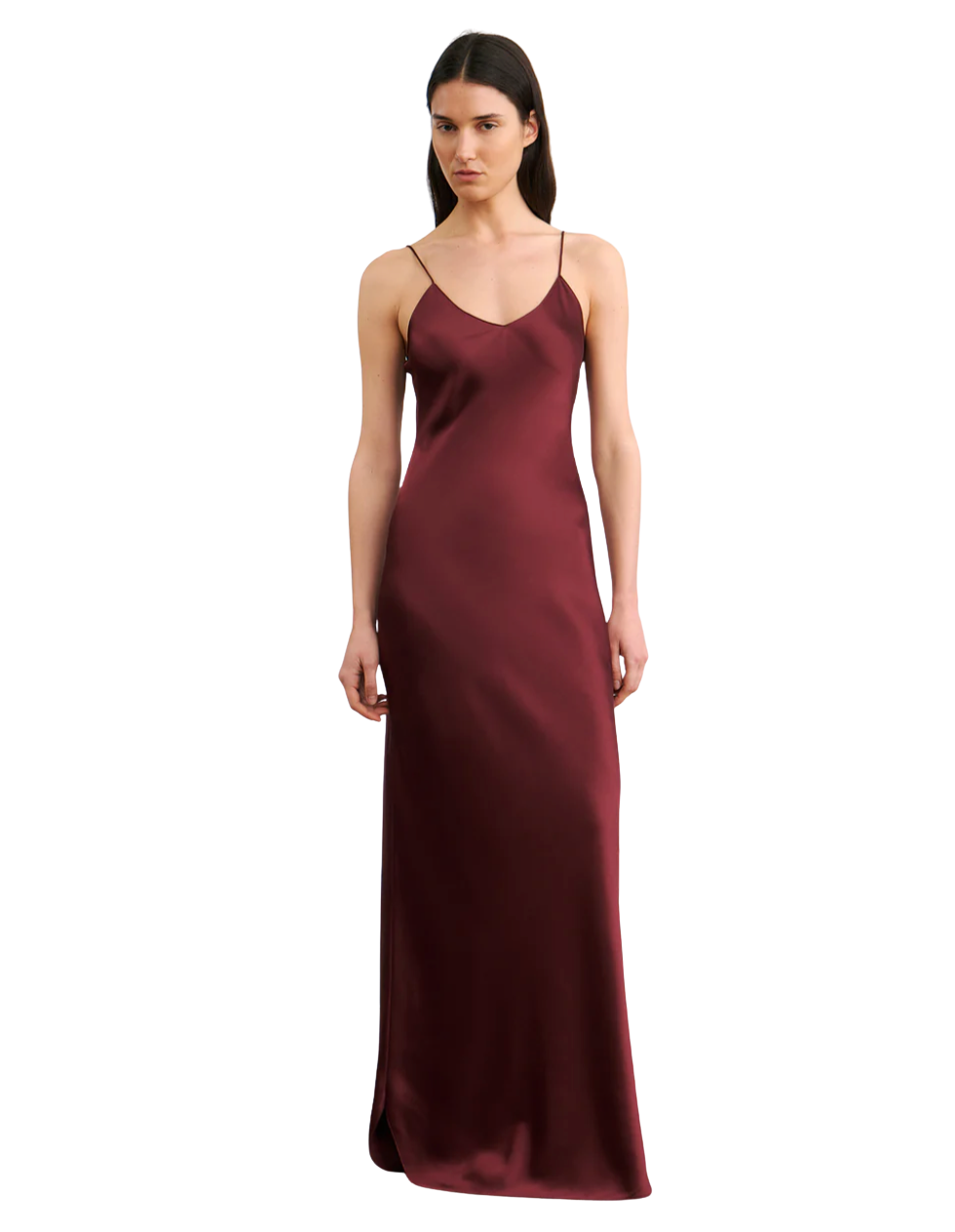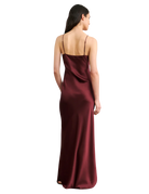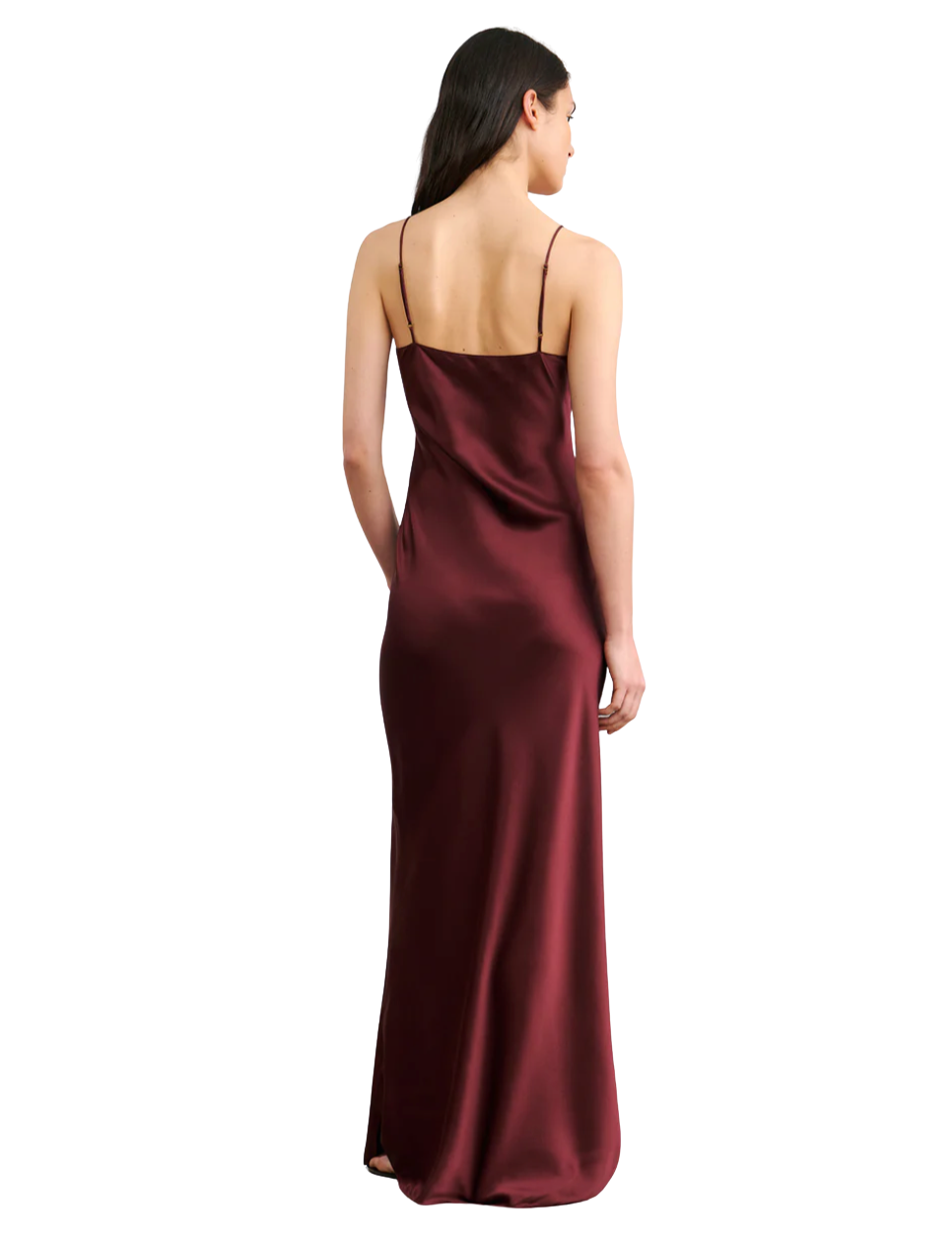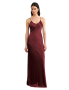 Bias cut floor length gown in silk charmeuse. Adjustable skinny straps. Shirt tale detail at hem.
